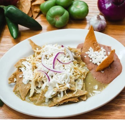 Totopos de maíz bañados en salsa verde con queso, acompañados de frijoles refritos.
