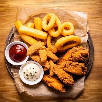 5 tenders de pechuga de pollo (salsa bbq, louisiana o natural) 6 pzas de aros de cebolla, acompañado de papas fritas especiadas y aderezo ranch.