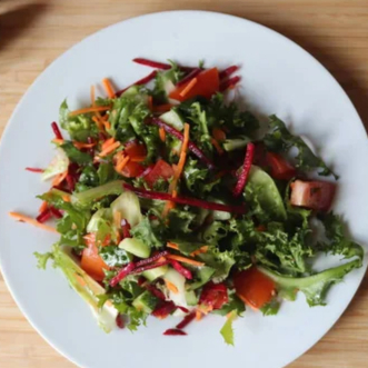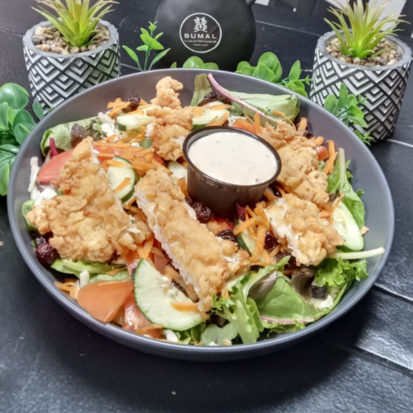 Mix de lechugas, pollo crispy bañado en salsa macha mezclado con arandano, pepino, tomate, zanahoria, queso menonita, ajonjoli negro y aderezo ranch.