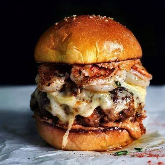Pan artesanal, camarones salteados en salsa siracha dulce, queso crema, queso menonita, tocino, chicharón de chile serrano acompañado de papas fritas especiadas.