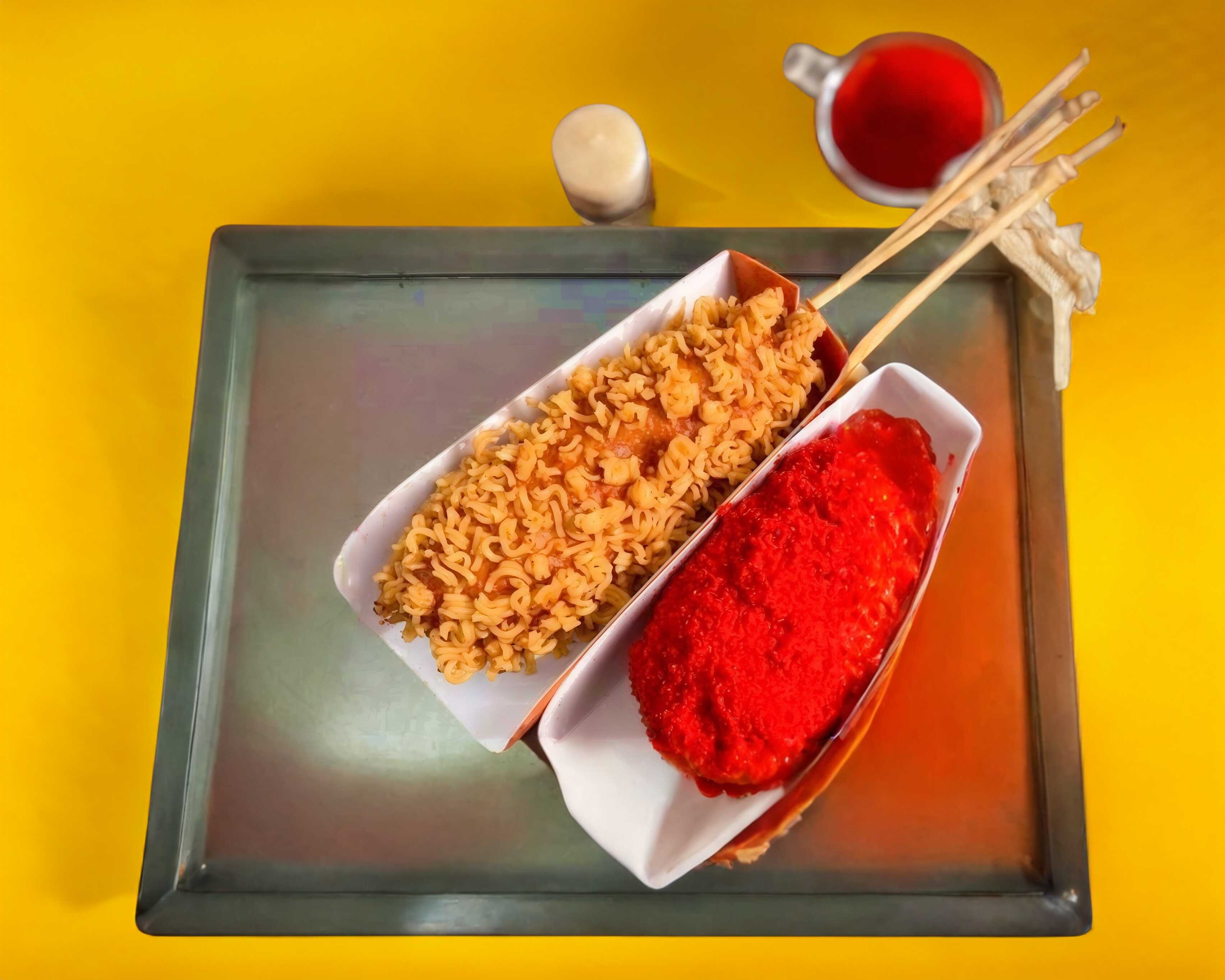 Queso Morzaadella, salchicha, Ramen maruchan, panko y aderezos