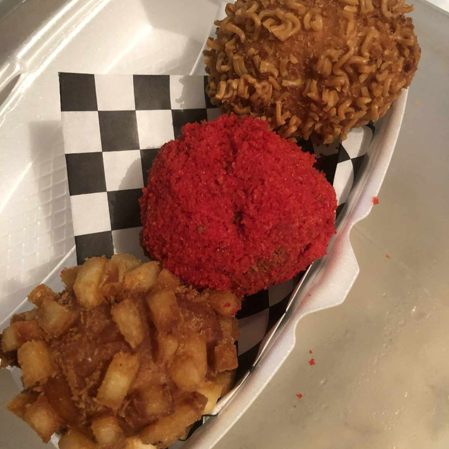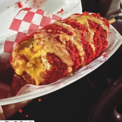 Queso Mozzarella, salchicha, panko, Cheetos Flamin hot y aderezos
