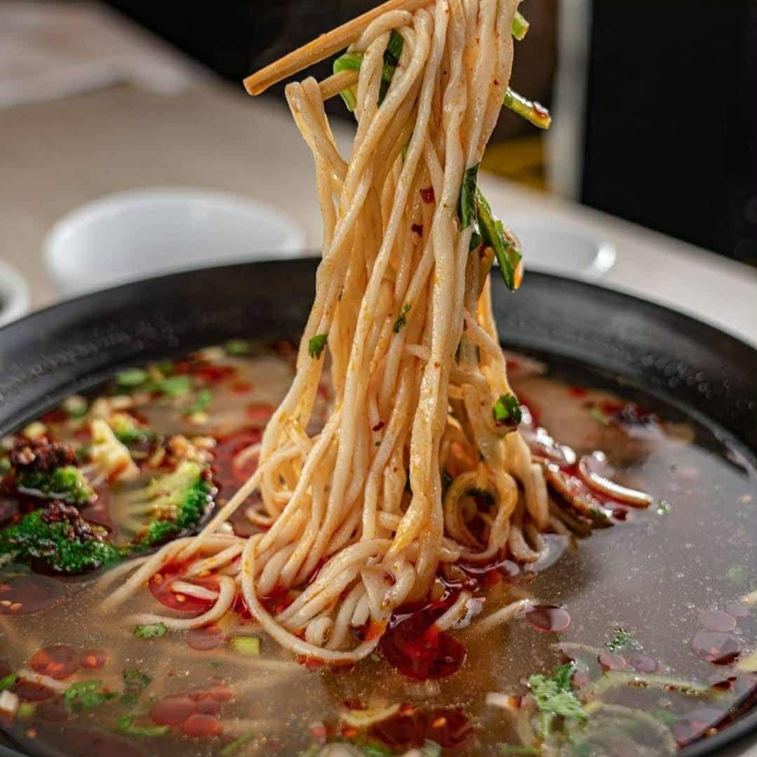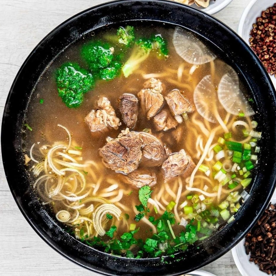 Sopa con Tofu, Zanahoria, Brocoli, pimientos, Bamboo, champiñones y raíz de frijol, con Noodles