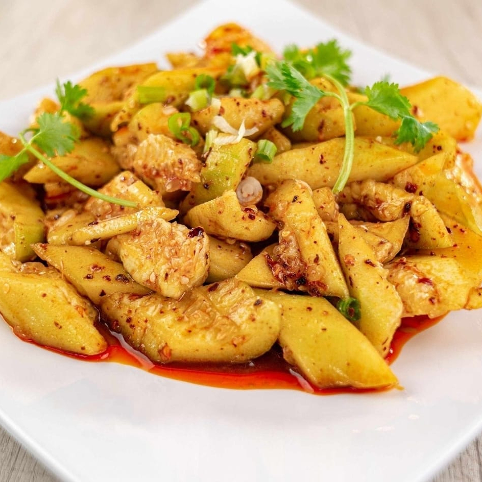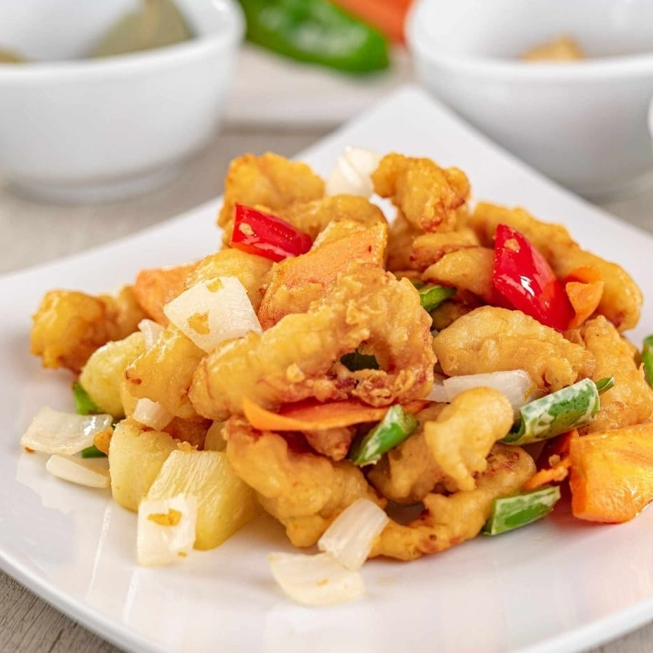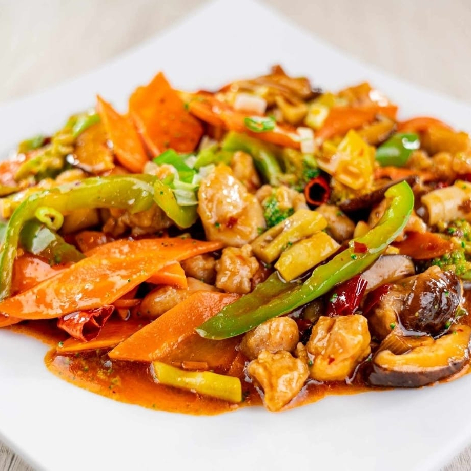 4 piezas. Pollo en salsa picante con zanahoria, apio, pimiento verde y cebolla.
