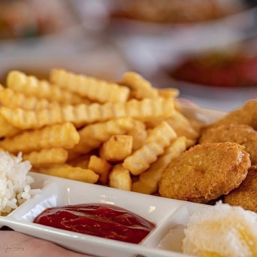 Chicken Nuggets, Papas fritas, bao de chocolate y Jugo Manzana.