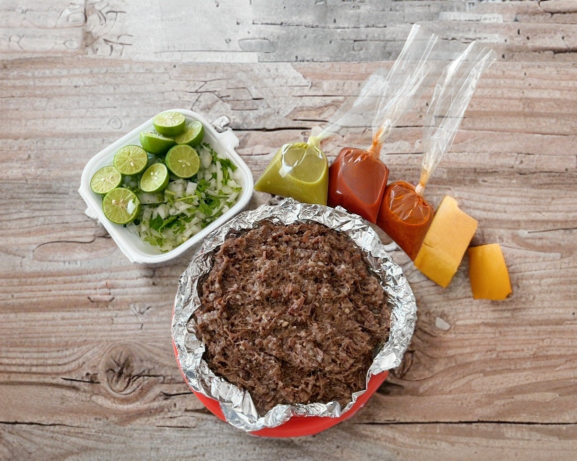 Tortillas de maíz, 1 kilo de barbacoa, cebolla, cilantro, salsas y limones.