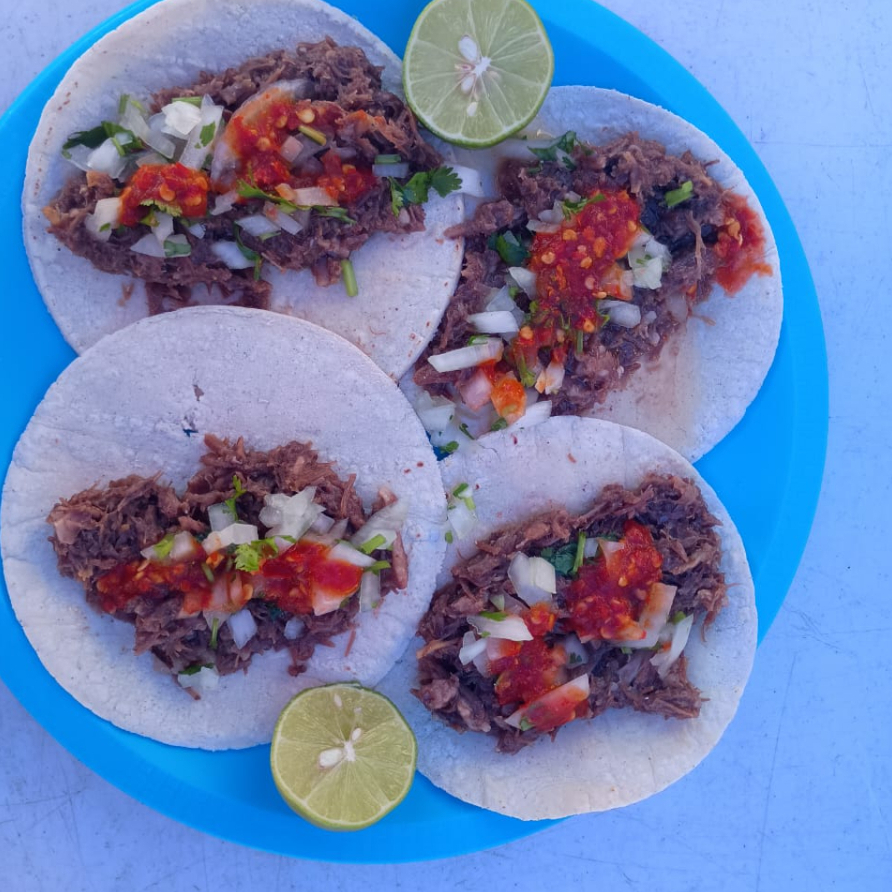 TACOS DE BARBACOA ACOMPAÑADOS DE SALSA VERDE, ROJA, LIMONES, CEBOLLA Y CILANTRO