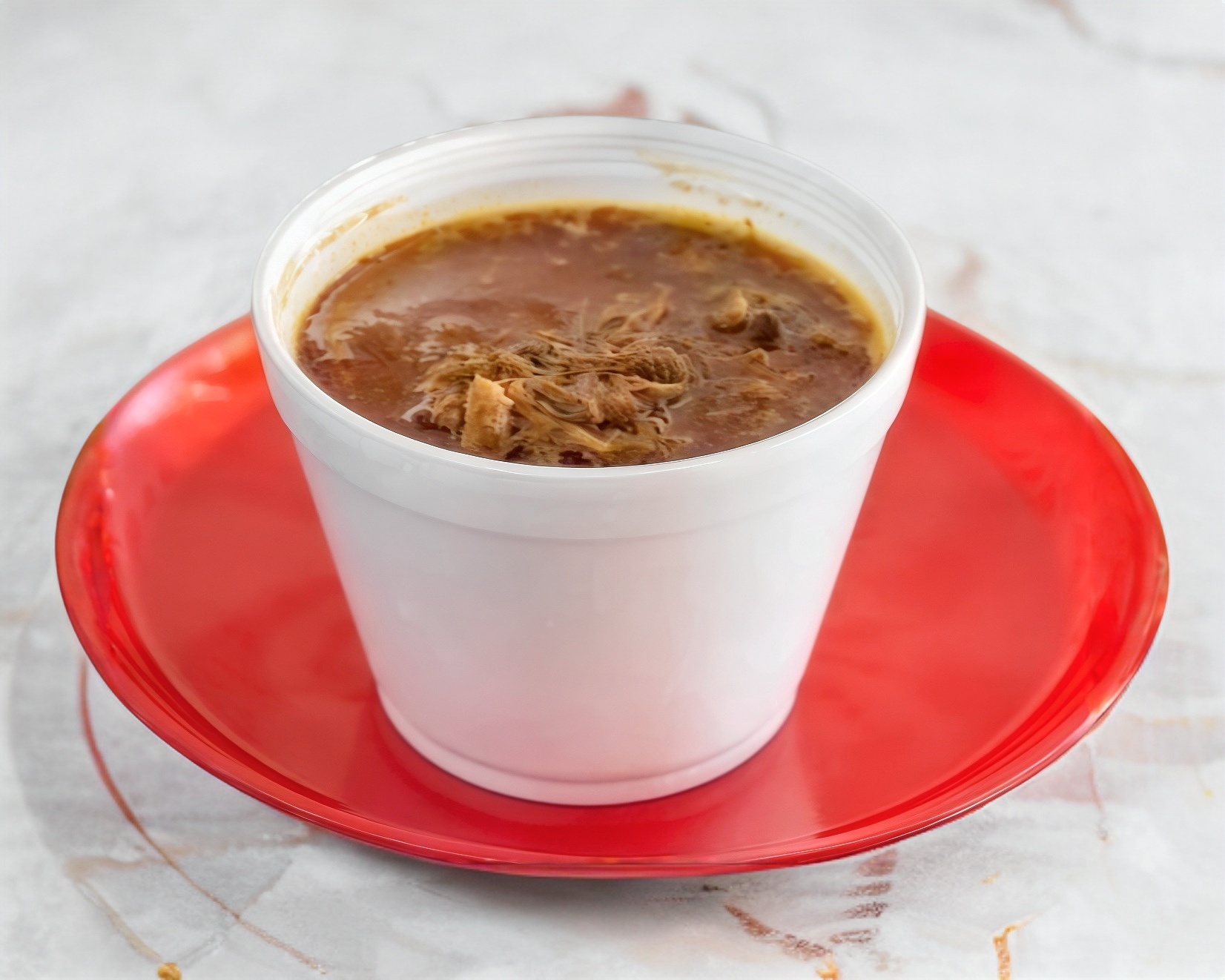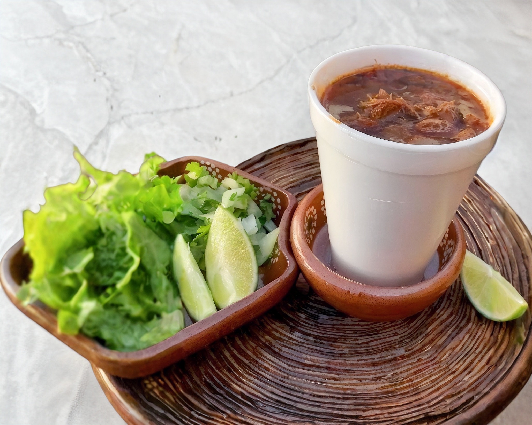 Un litro de consomé de barbacoa con una bolsa de cebolla y una bolsa de salsa con 5 tortillas