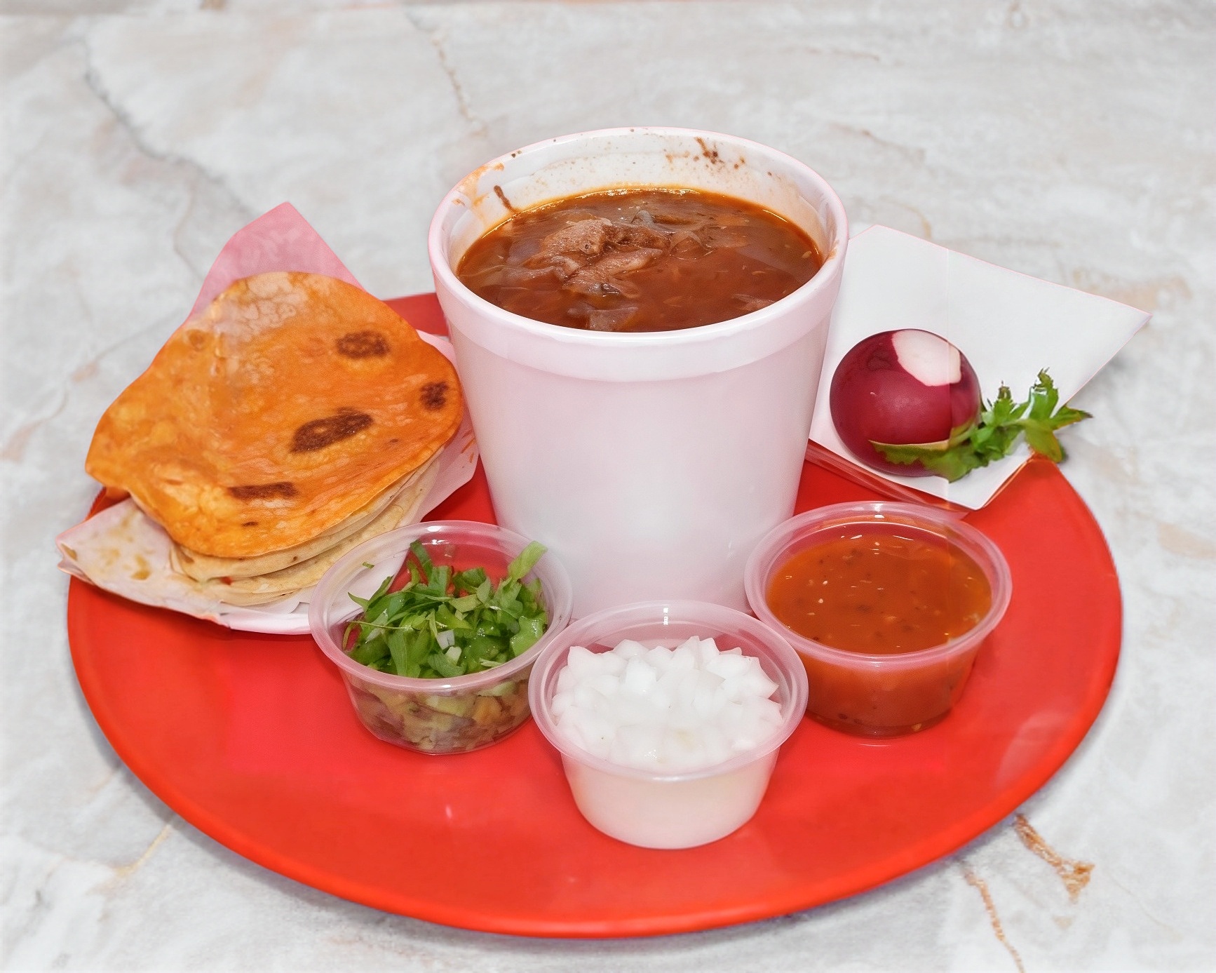 Medio litro de birria con. Una bolsa de cebolla y una de salsa con 3 tortillas