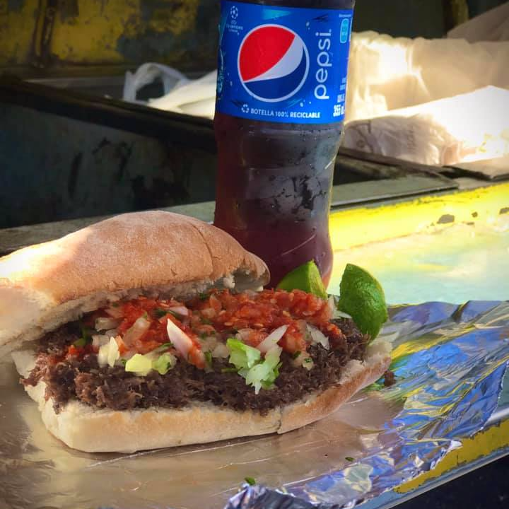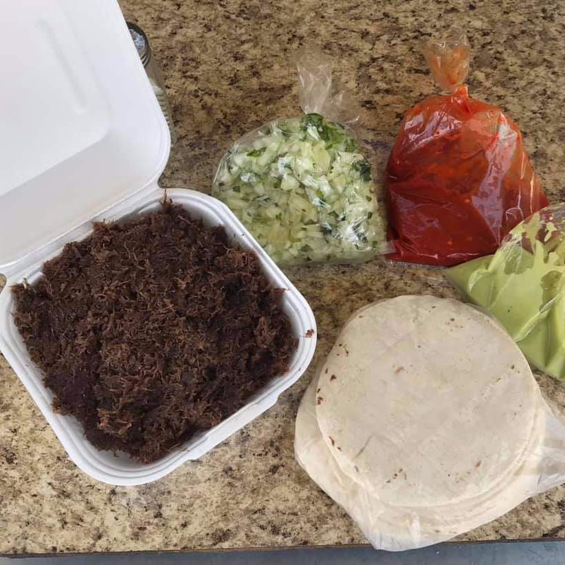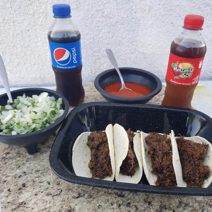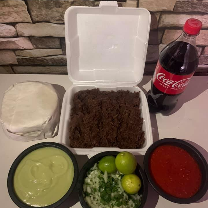 Acompañado de salsa, cebolla con cilantro, guacamole y tortillas.