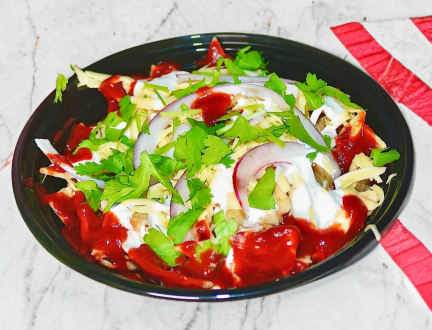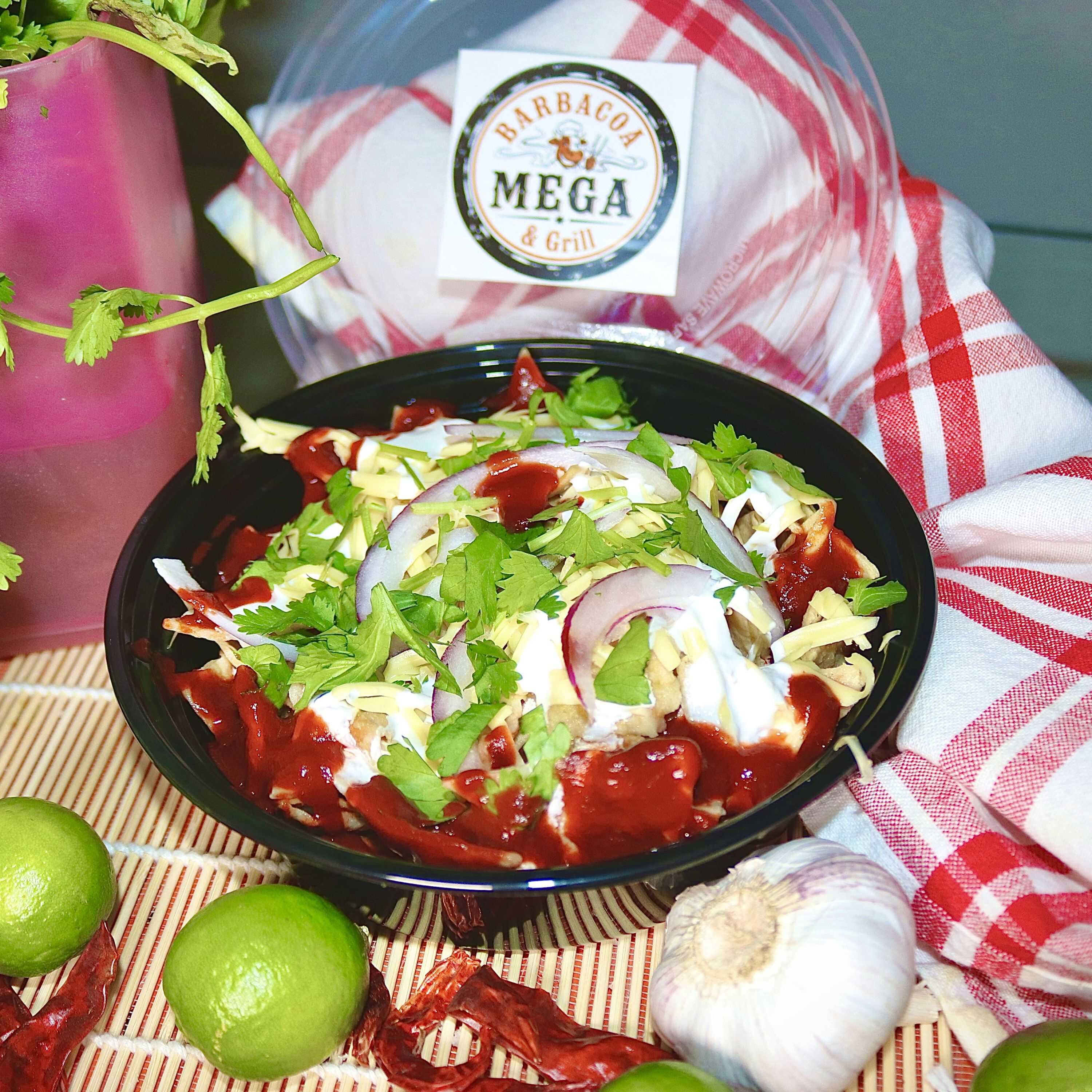 Orden de 360g, totopos bañados en salsa roja, crema, cebolla morada y cilantro.