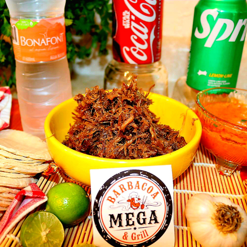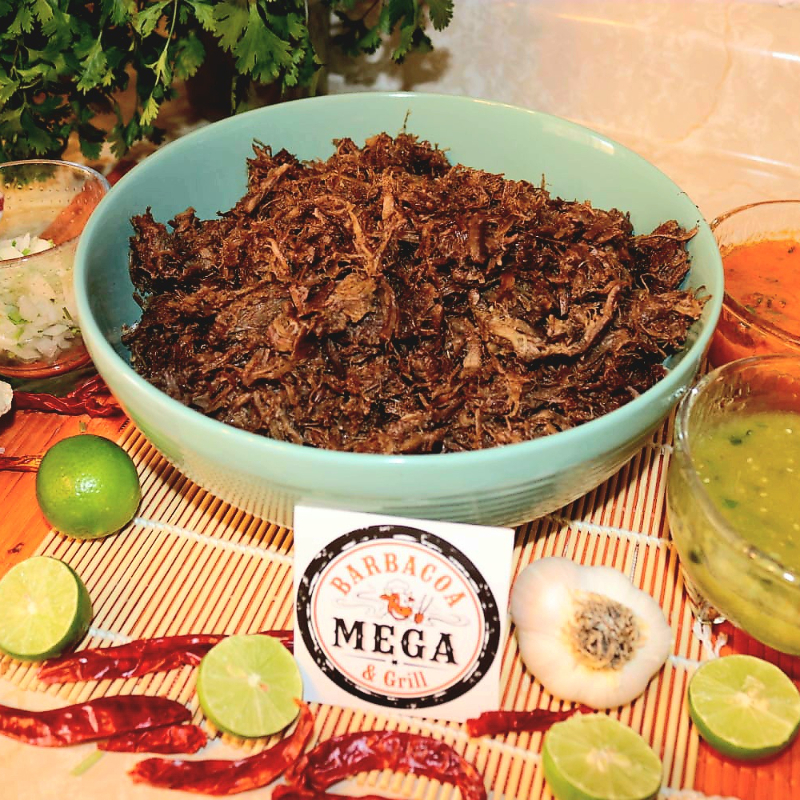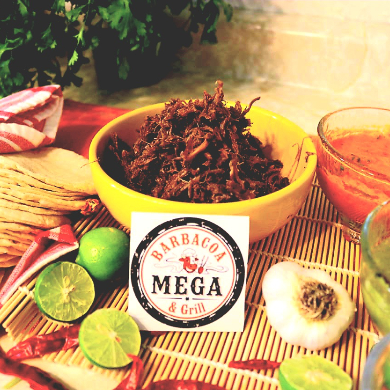 Kilo de barbacoa MEGA con tortillas, salsas, cebolla con cilantro y limones.