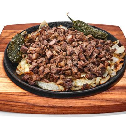 Media parrillada de carne de Sirloin para dos personas, incluye: 2 quesadillas, 2 papas, salsas y tortillas.