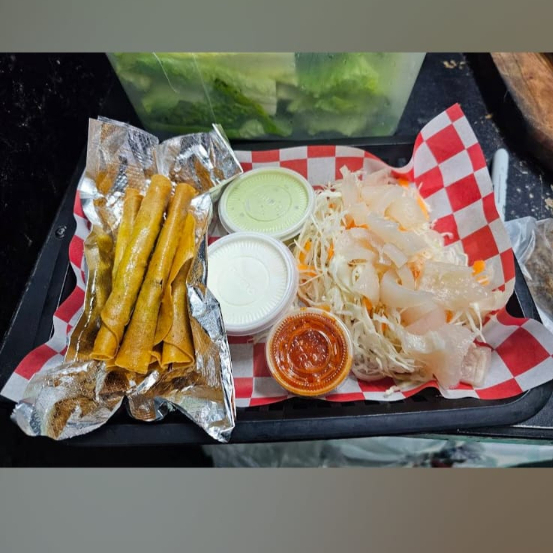 5 flautas de carne acompañadas de repollo/lechuga con zanahoria, cueritos, guacamole, crema y salsa de árbol