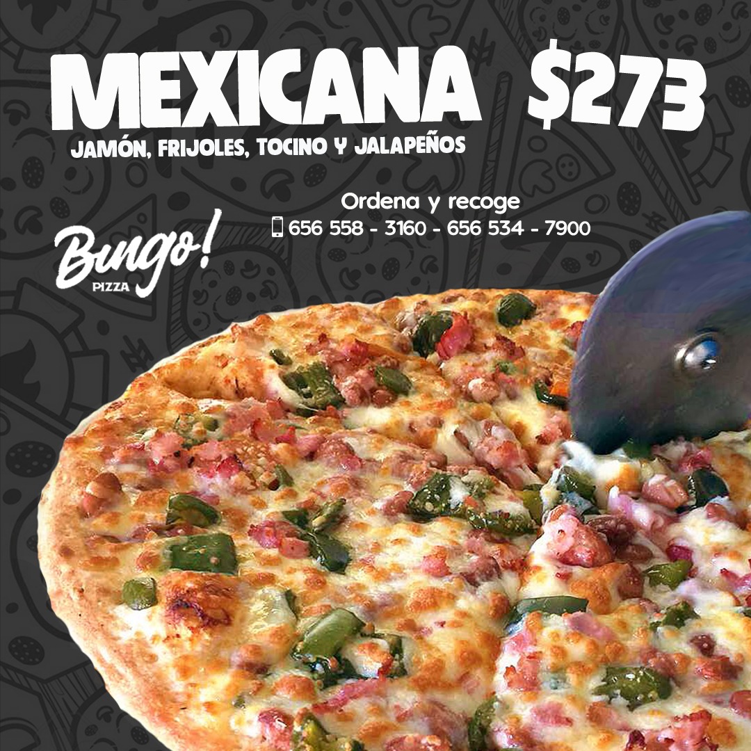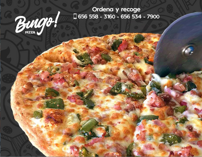 Jamón, salami, tocino, champiñones, cebolla, aceituna negra y morrón.