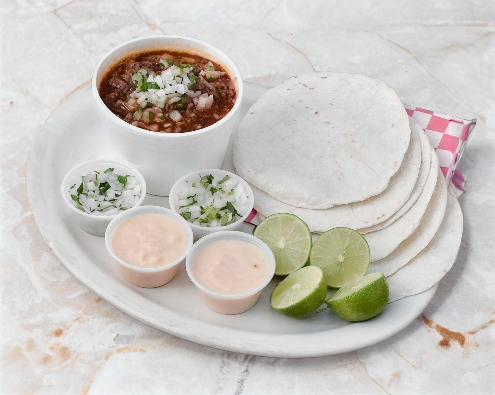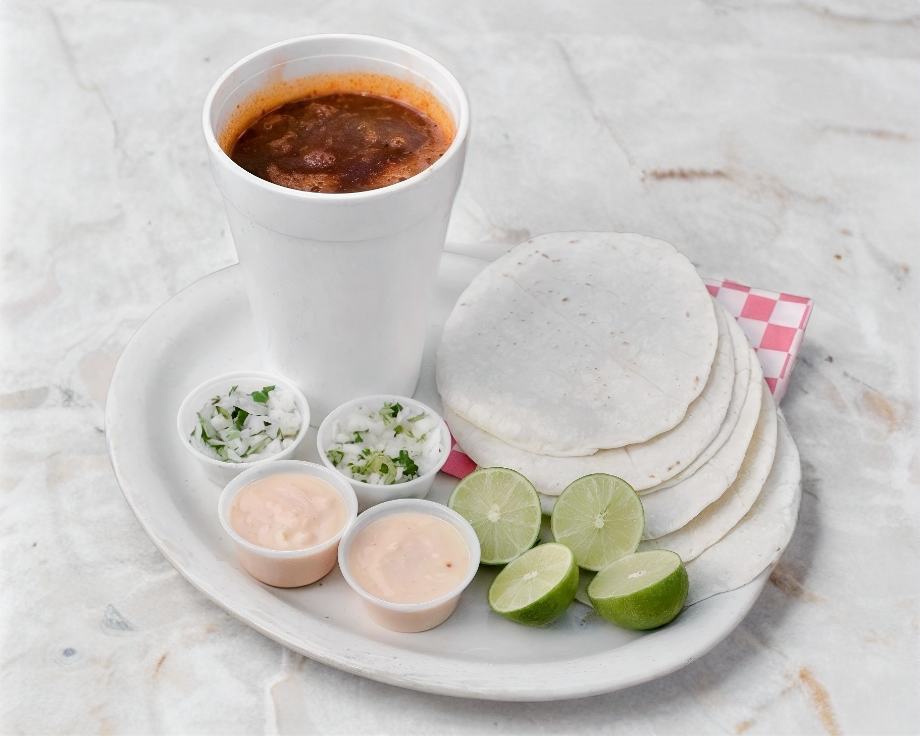8 oz de consomé, tortilla limón, cebolla con cilantro, cebolla morada curtida y salsita.