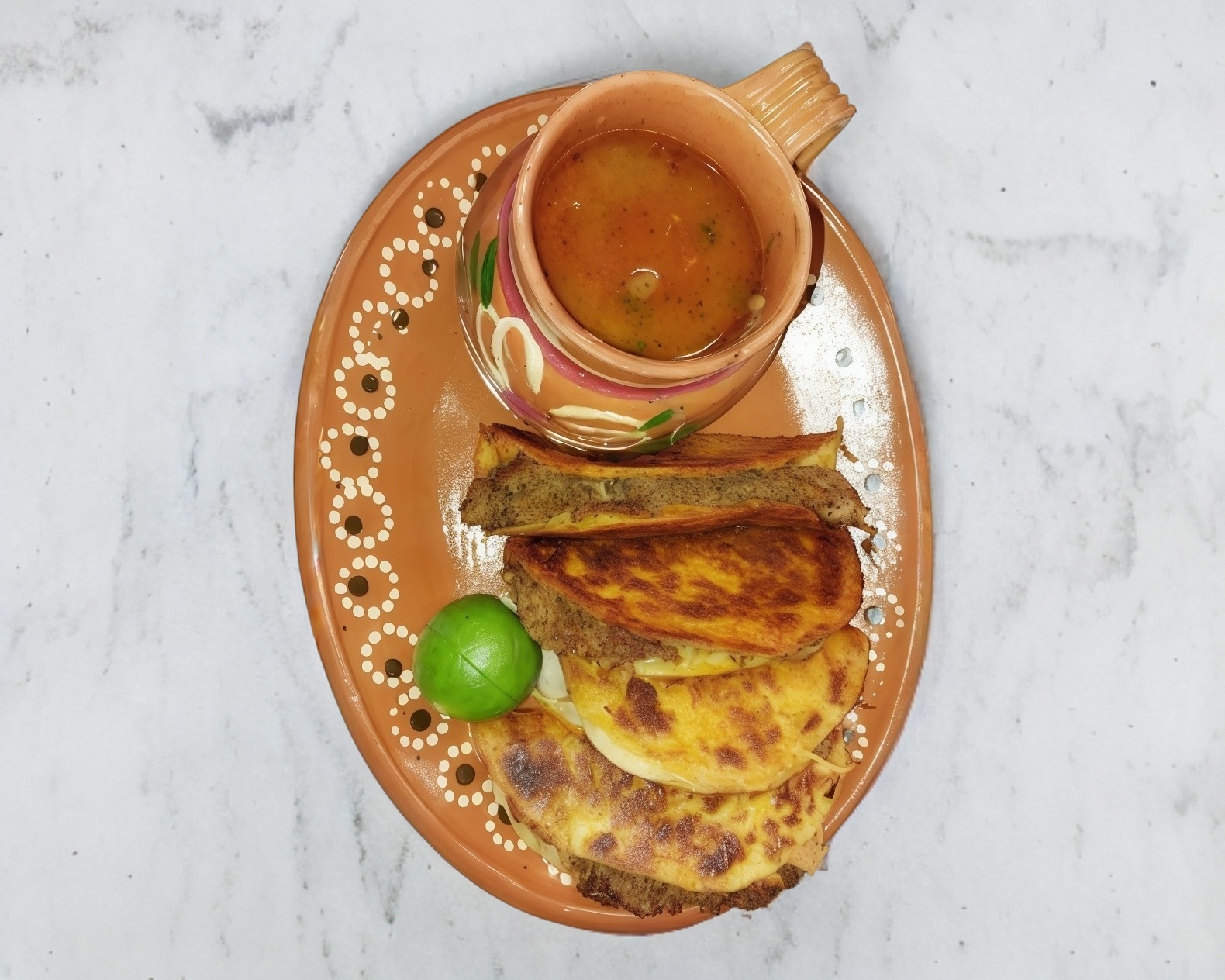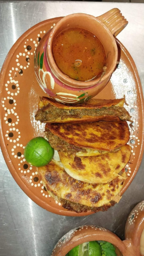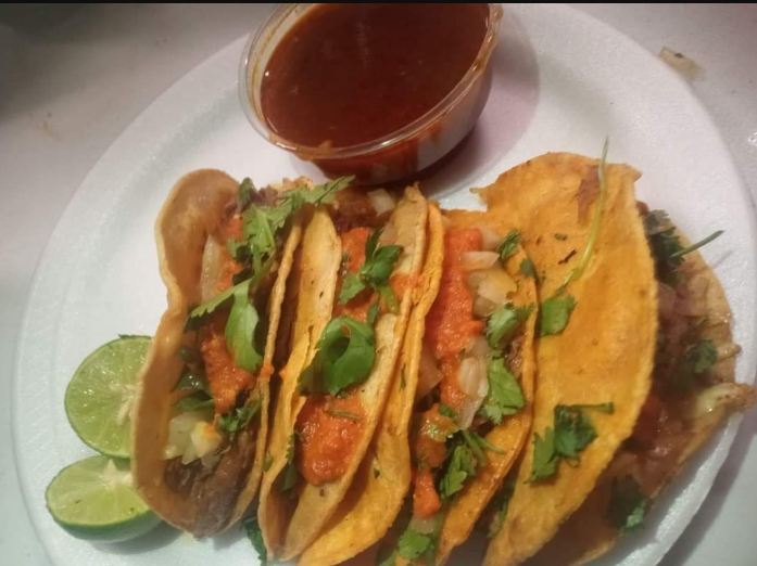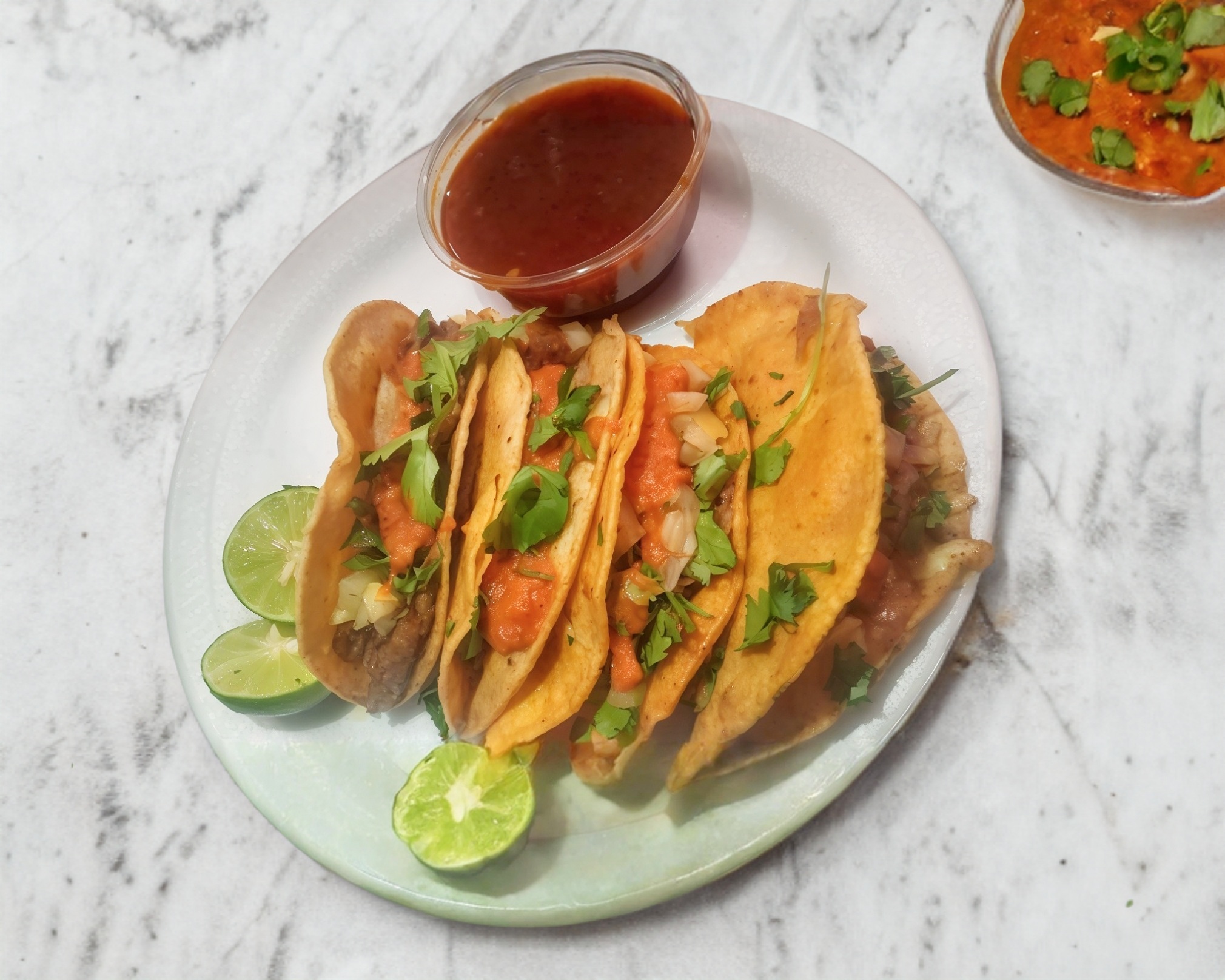 Acompañados de 8 oz de consomé, limón, cebolla con cilantro, cebolla morada curtida y salsita.