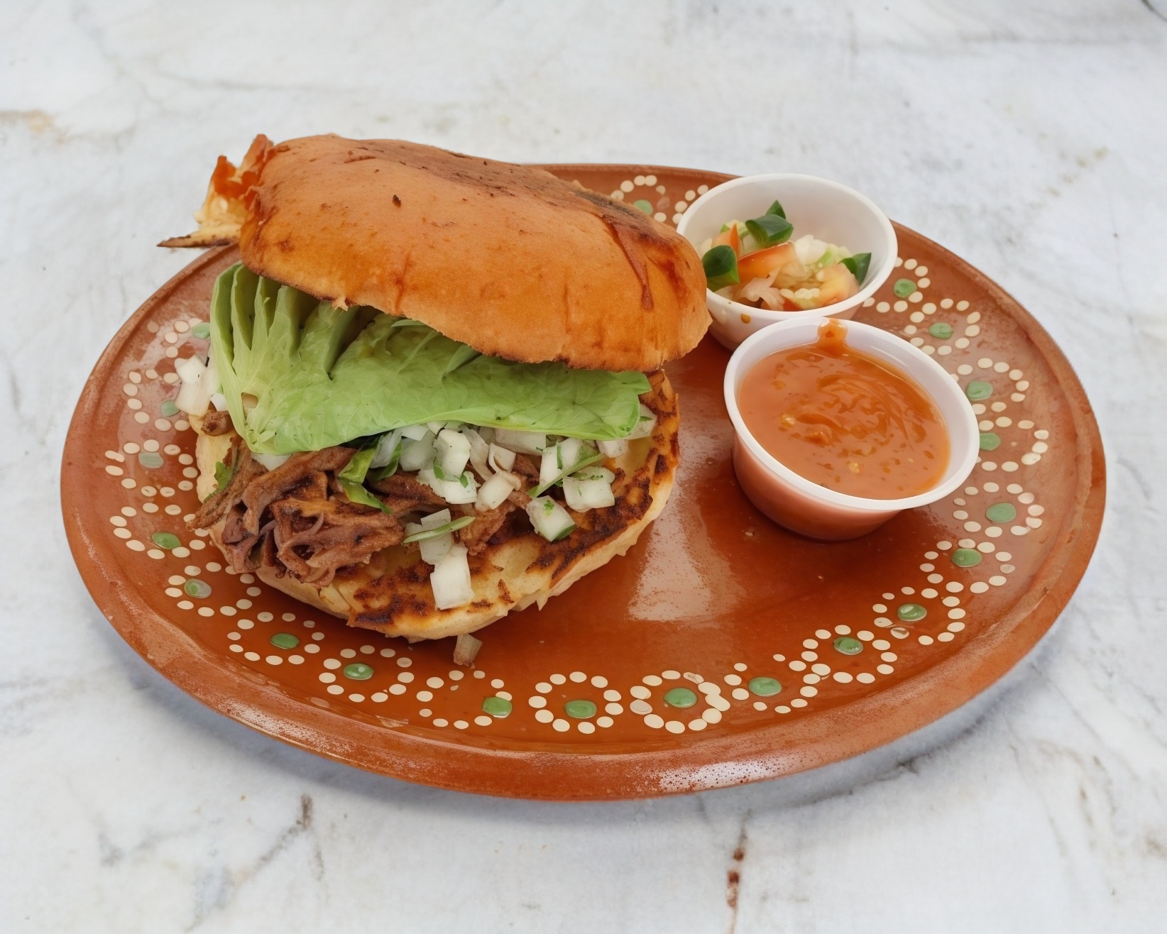 Torta con birria de costilla en pan Virgiana, con una costra de queso y aguacate en abanico, 8 oz de consomé, limón, cebolla con cilantro, cebolla morada curtida y salsita. Elige la salsa.