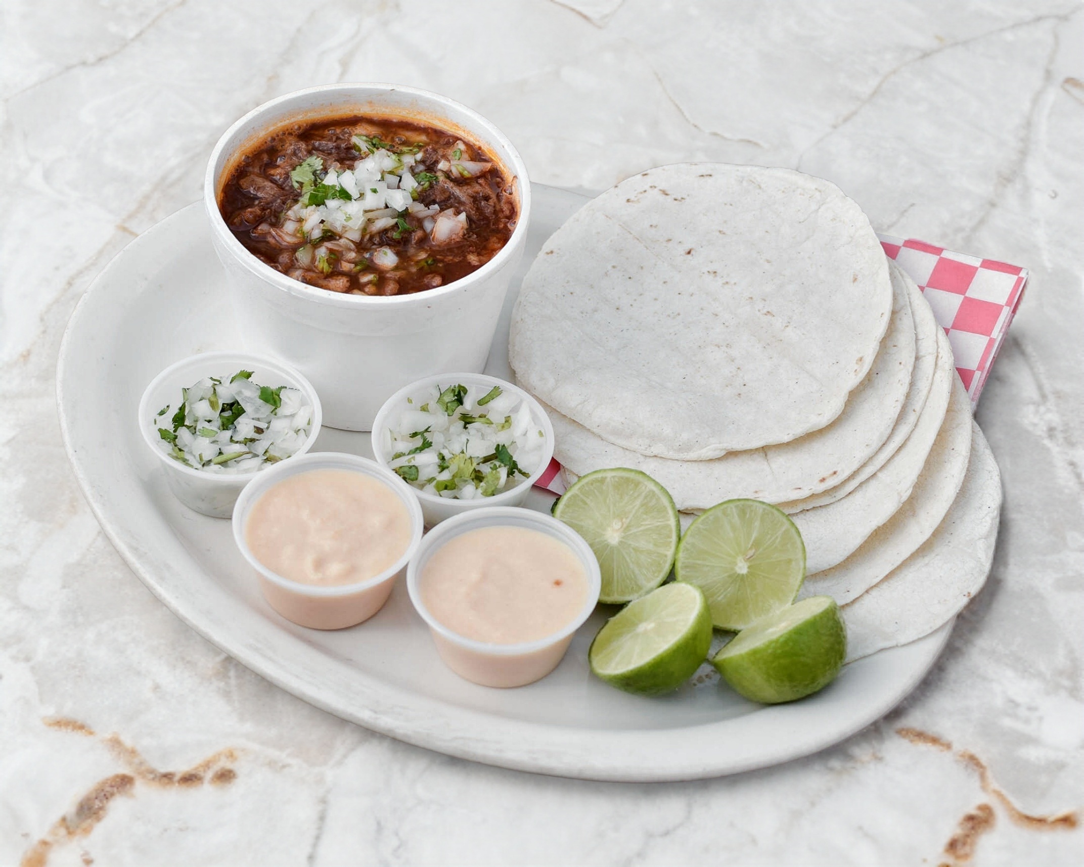 1 Litro de birria de res en su consomé, tortilla de maíz, cebollita con cilantro y limón.