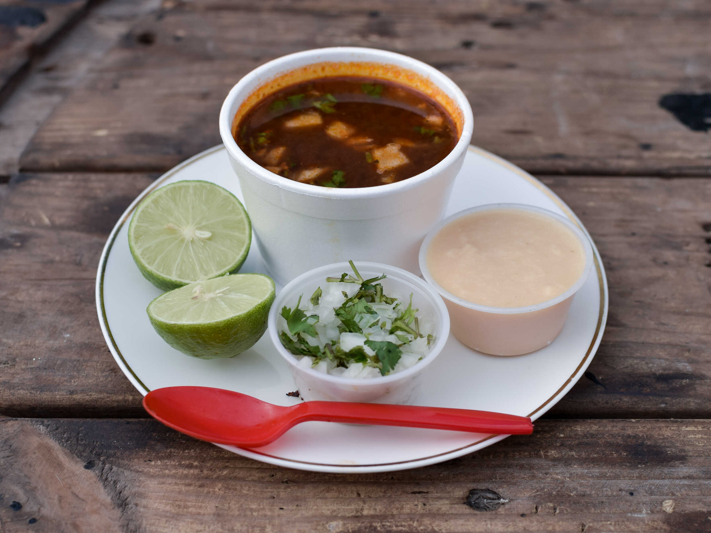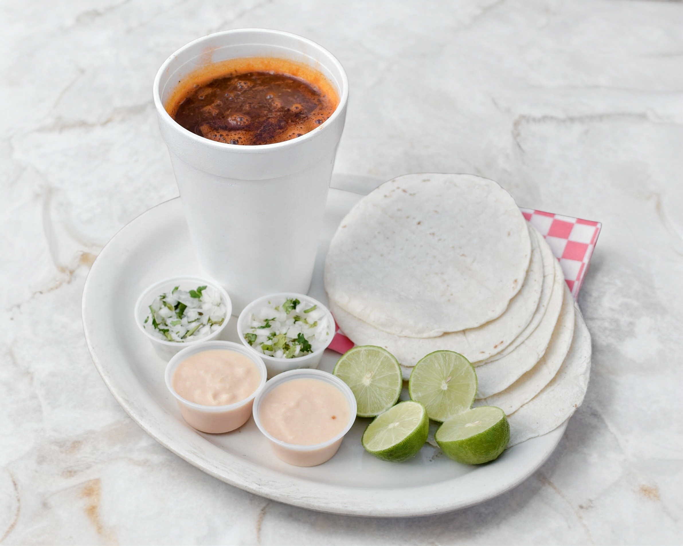 Consomé de 8 Oz, cebolla, cilantro y limón.
