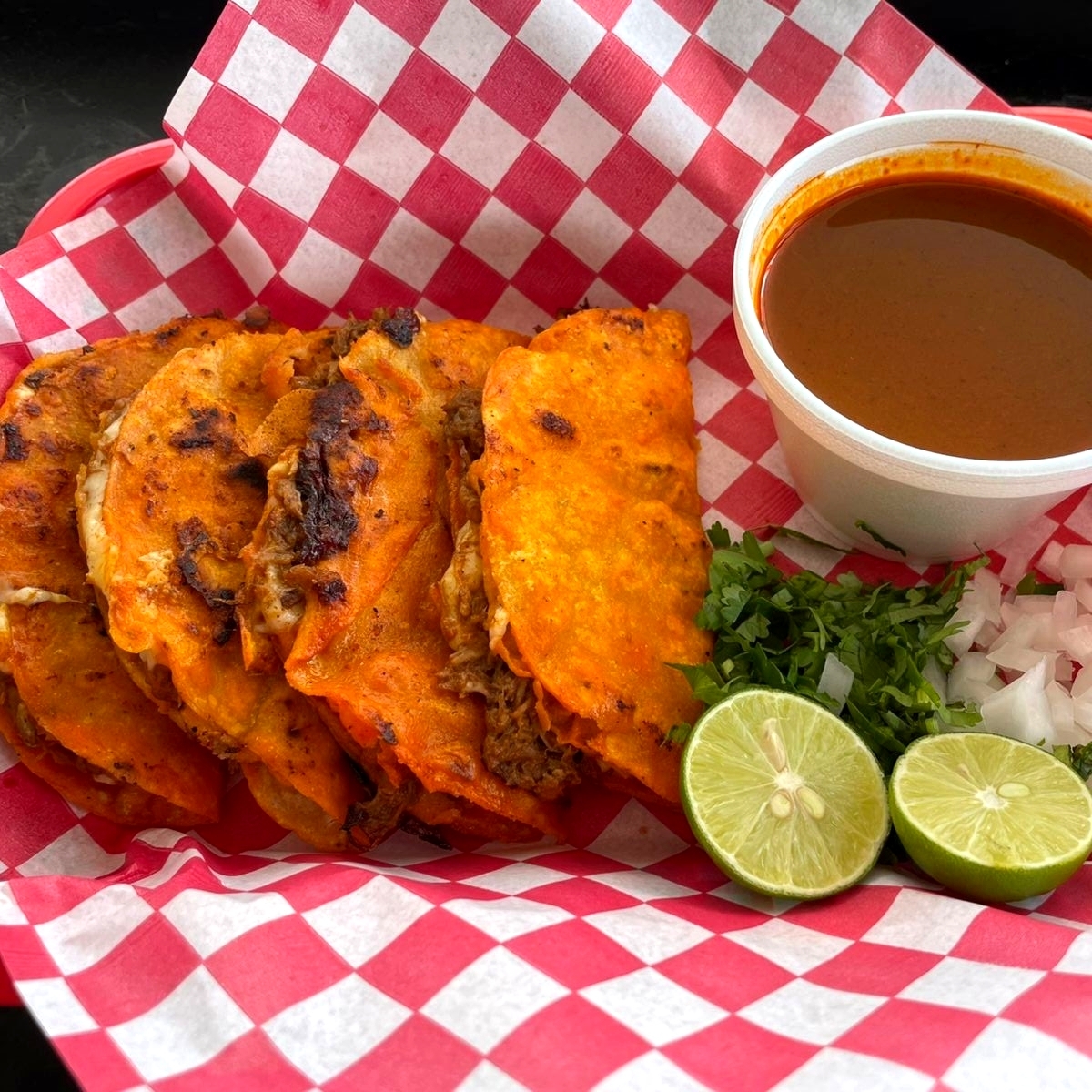 Deliciosas quesadillas de maíz con birria de res, acompañadas de consomé, cebolla, cilantro, salsa picante y limón.