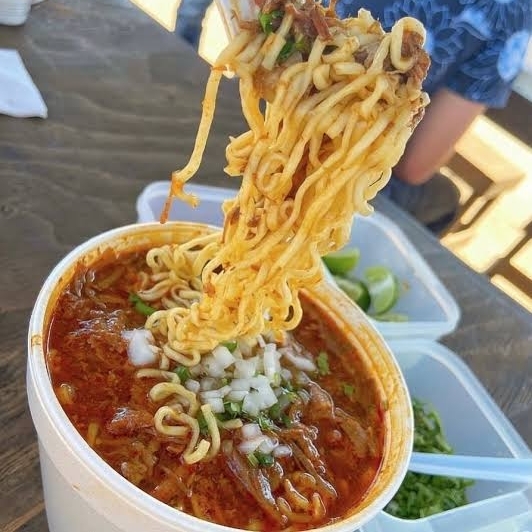 Deliciosos fideos estilo ramen con birria de res acompañados de cebolla, cilantro, queso, salsa picante y limón.