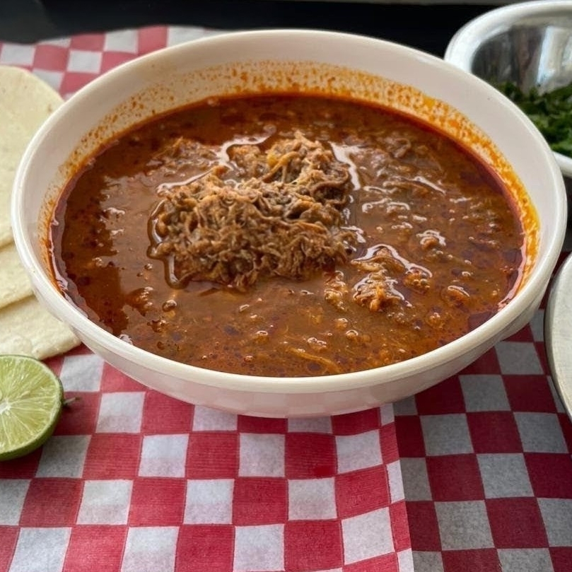 Deliciosa birria de res en su caldo, acompañada de tortillas, cebolla, cilantro, salsa picante y limón.