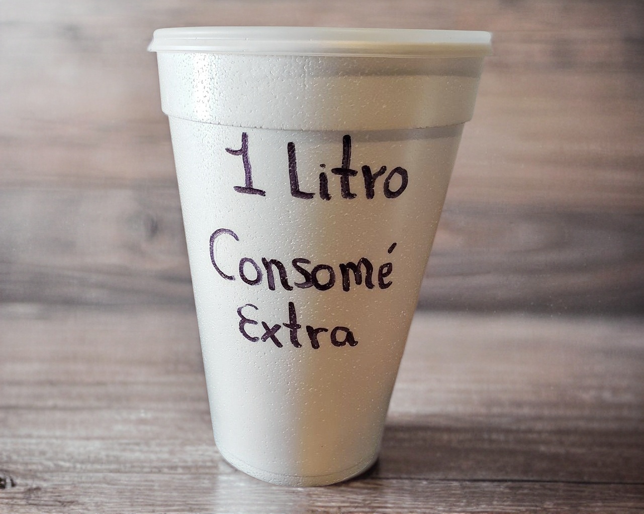 Puro consome (caldo), sin carne, en vaso de medio litro.