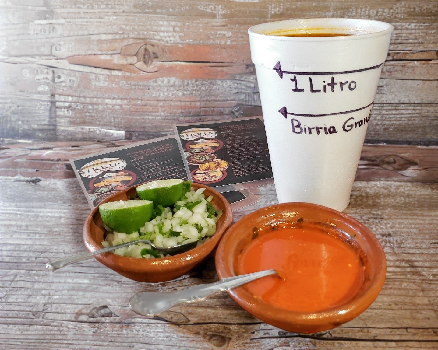 Birria de res con consome en vaso de 1 litro con su porcion correspondiente de tortillas, salsa y cilantro