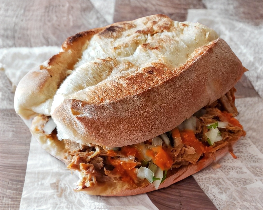Pan de blanco ligeramente tostado con birria. No incluye consome.
