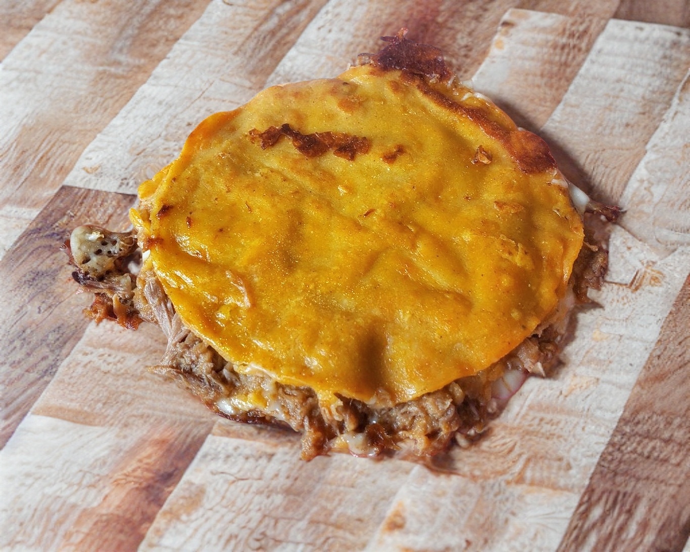 Tortilla Taquera de maíz abajo y arriba, con birria y queso. Dorada. El precio es por pieza. (Se incluye medio litro de consome a partir de 4 pzs.)