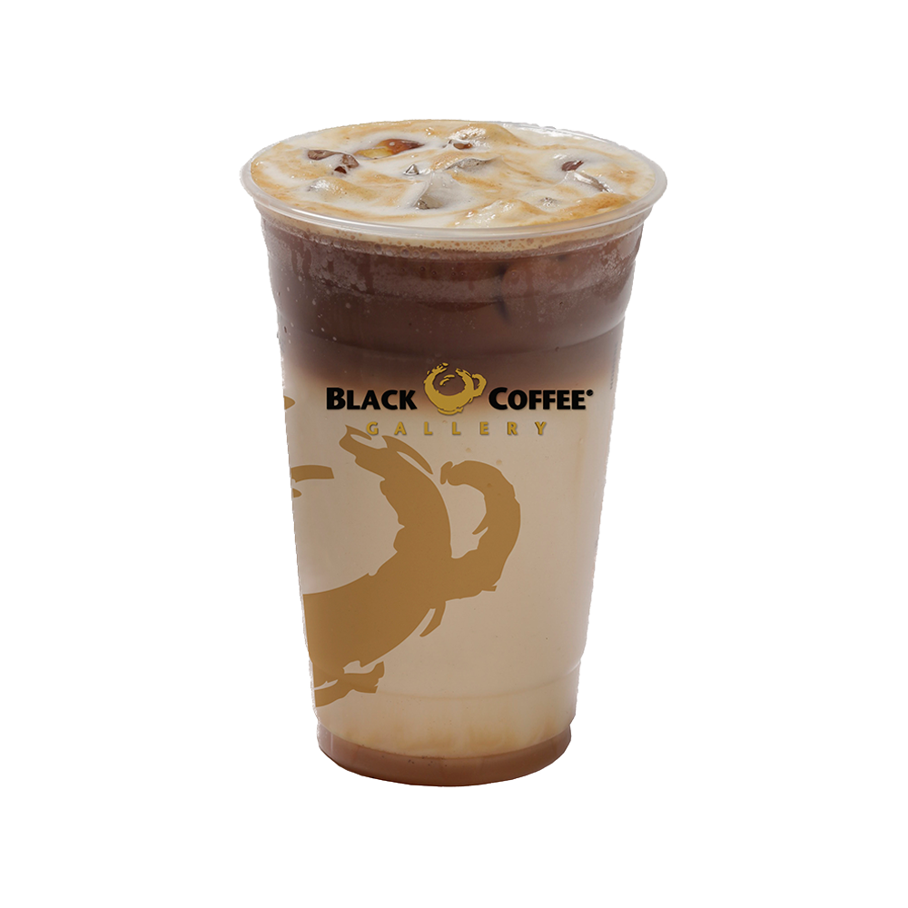 Café espresso Black Coffee y leche al vapor y caramelo en frío.