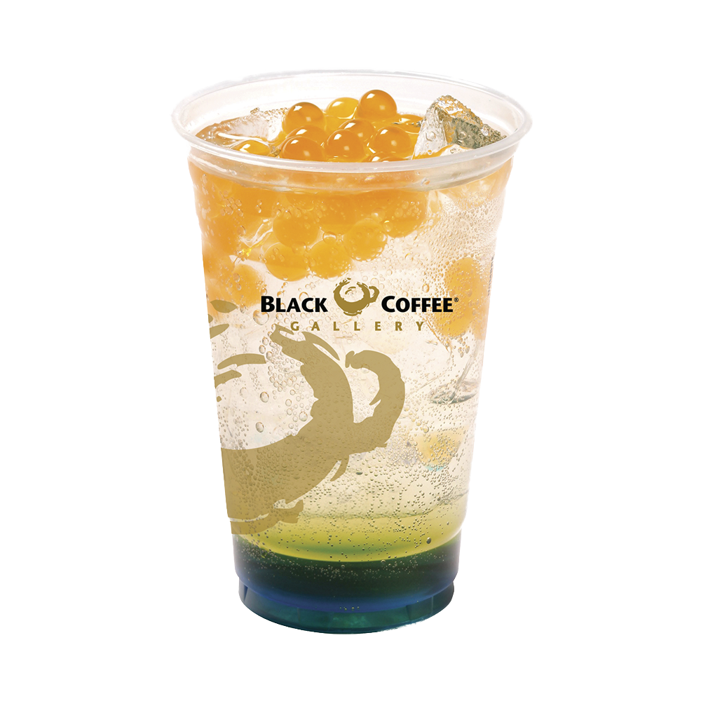 Soda refrescante con jarabe curazao y Popping Pearls.