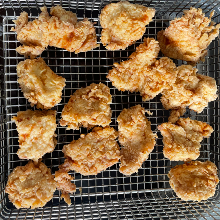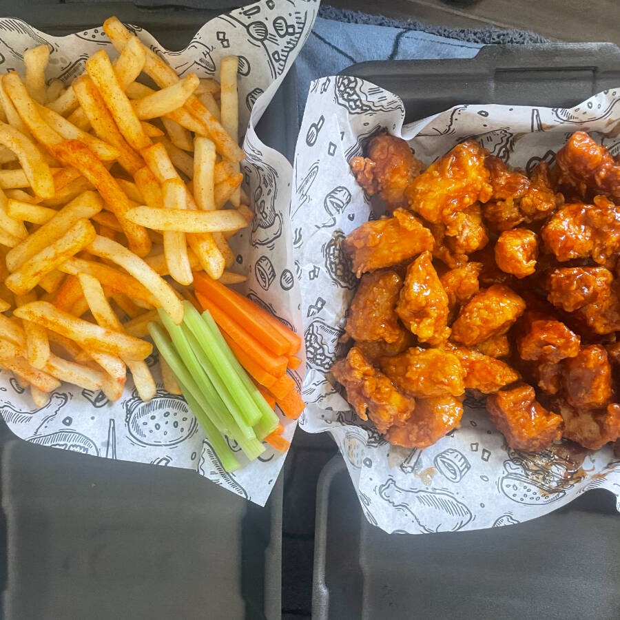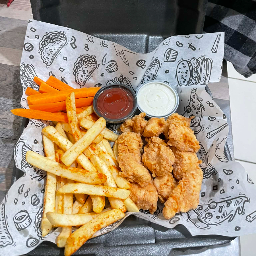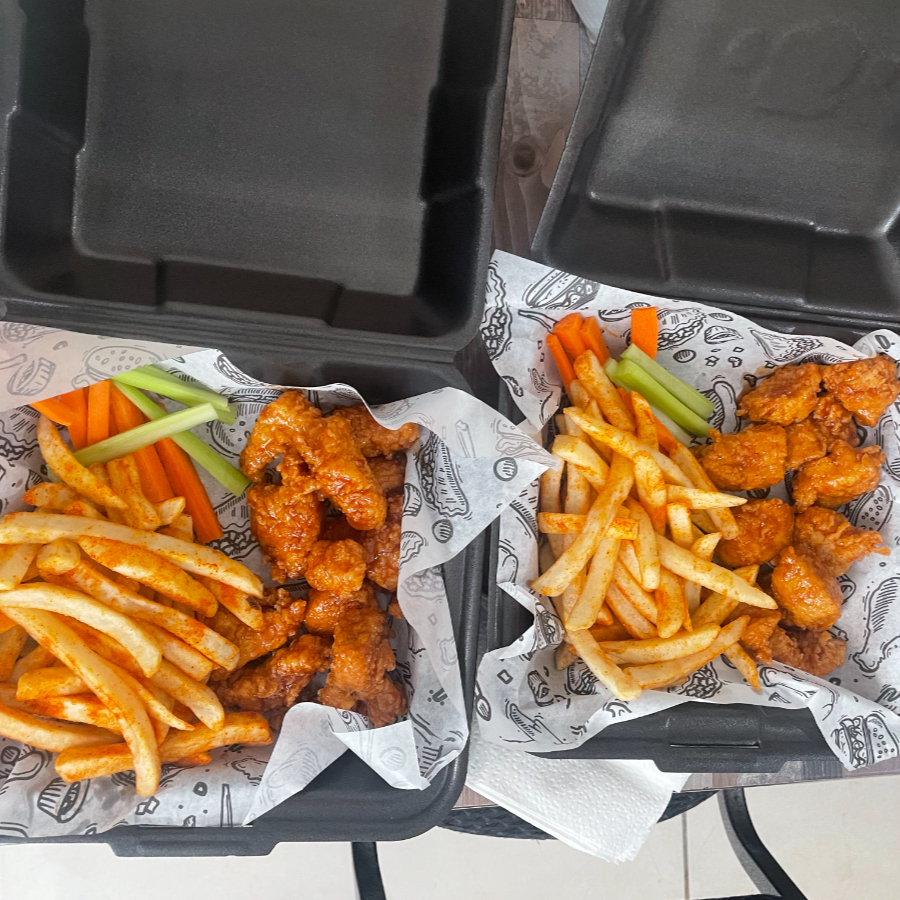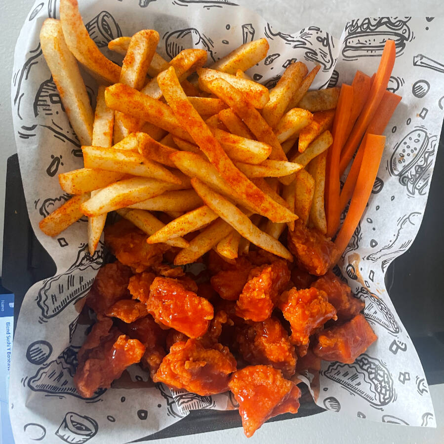 500gr (16-18)Trozos de pechuga de pollo bañados en la salsa de su eleccion, 500gr papas fritas, Ranch,Catsup, vegetales