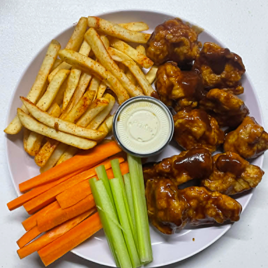 180gr (6-8pzs) trozos de pechuga de pollo bañados en la salsa de su eleccion, papas,ranch, catsup, vegetales
