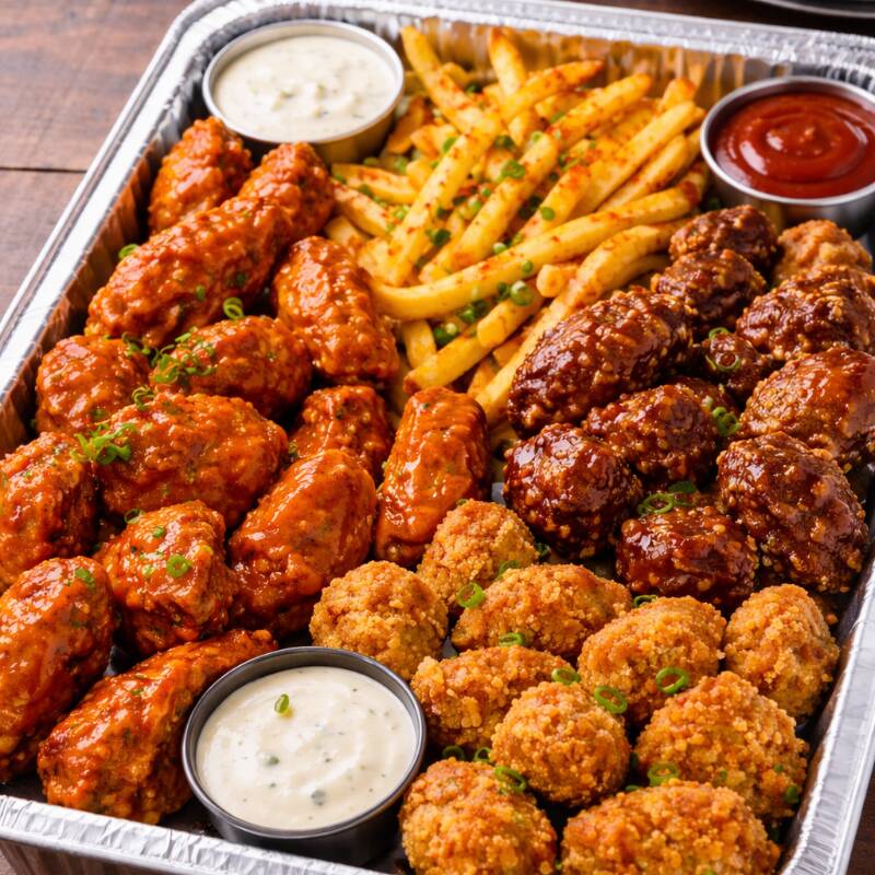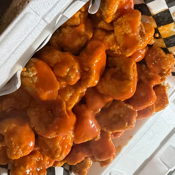 1kilo de pechuga bañada en tu salsa preferida con ranch. Incluye papas