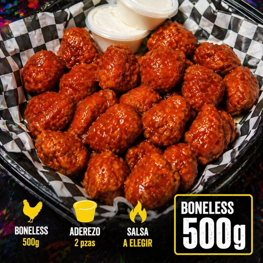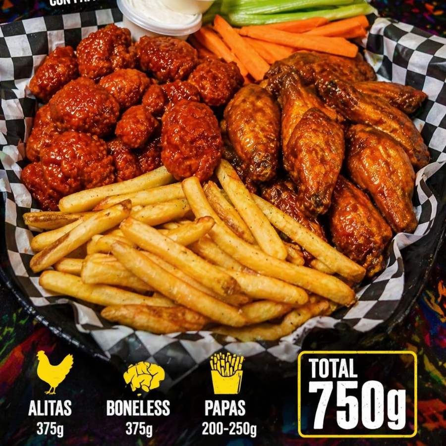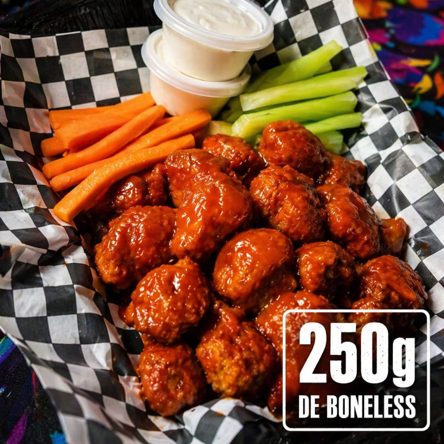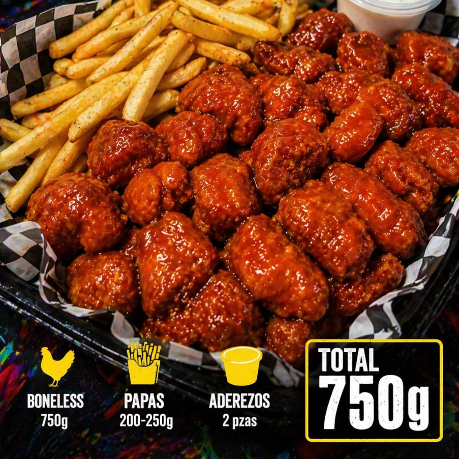 750 g boneless + 2 refrescos + 2 salsas + queso de aderezo