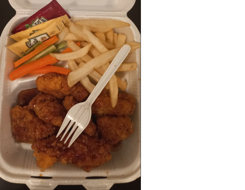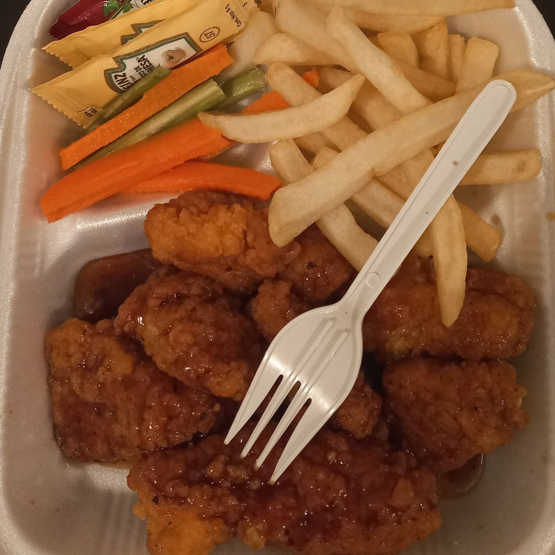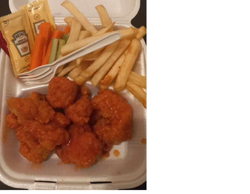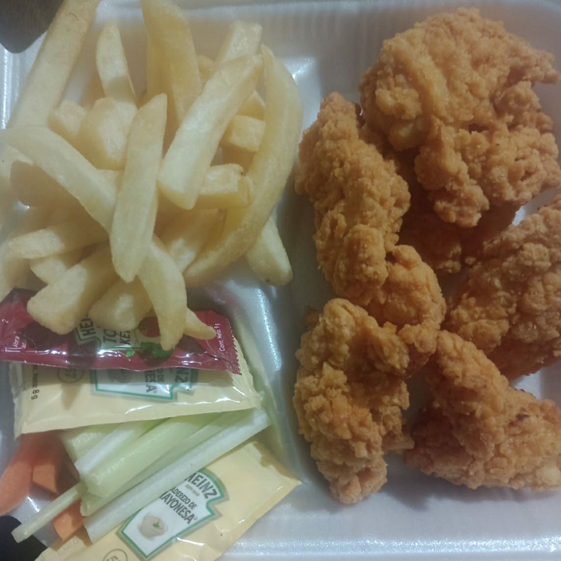 150 gramos de boneless, 50 gramos de papas,catsup,aderezo,apio,zanahoria