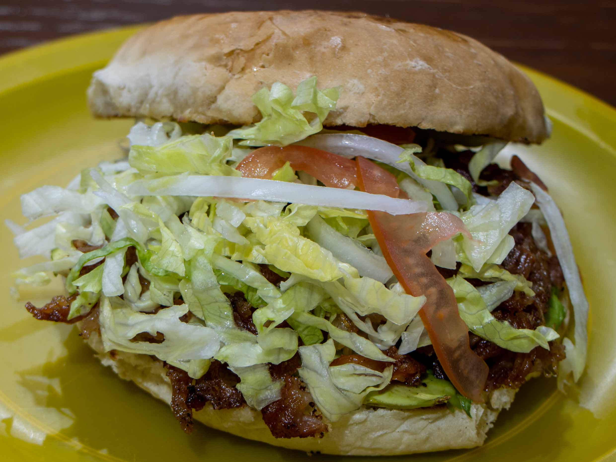 Lechuga, tomate, cebolla, queso amarillo y mayonesa.