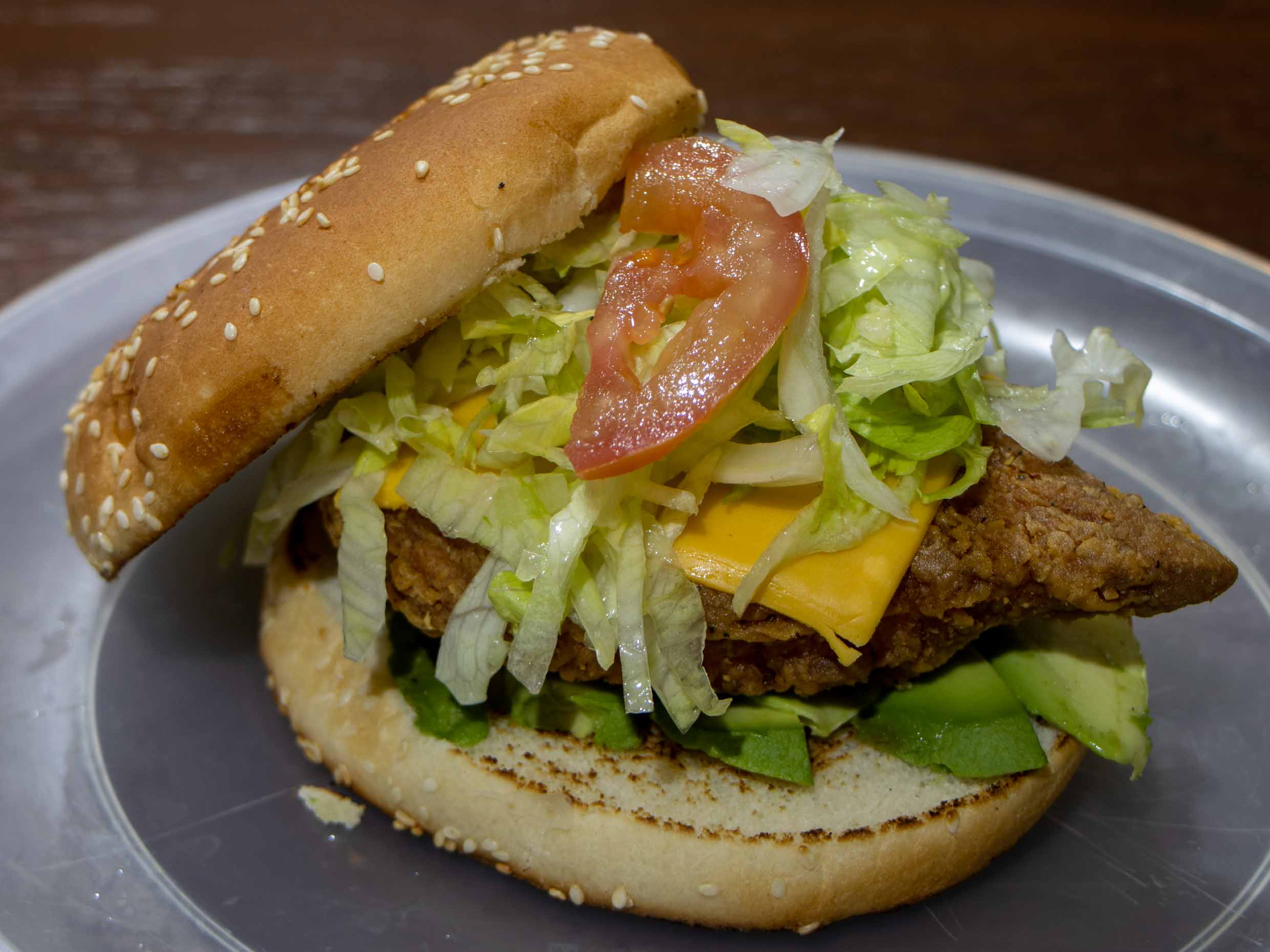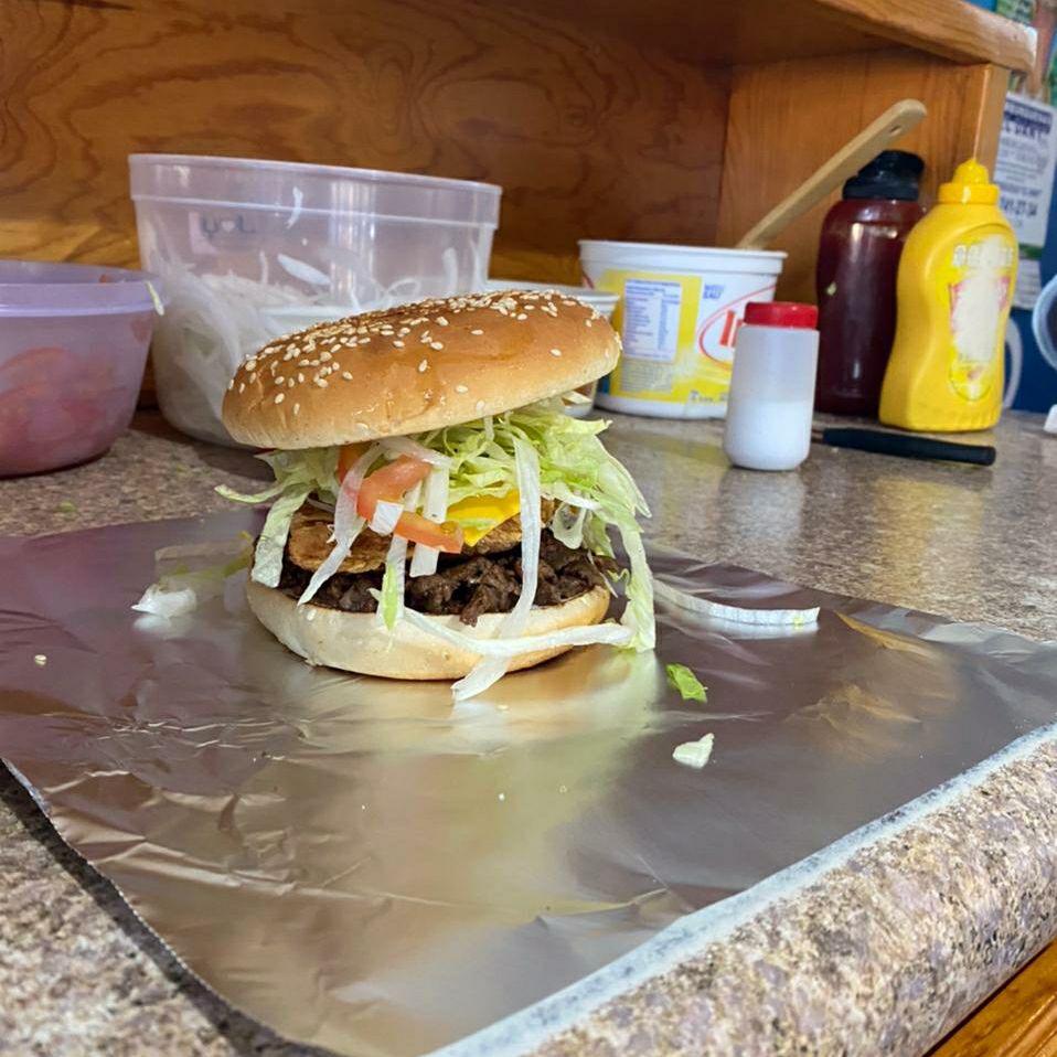 Pechuga de pollo, bistec, lechuga, tomate, cebolla, mayonesa y queso amarillo.