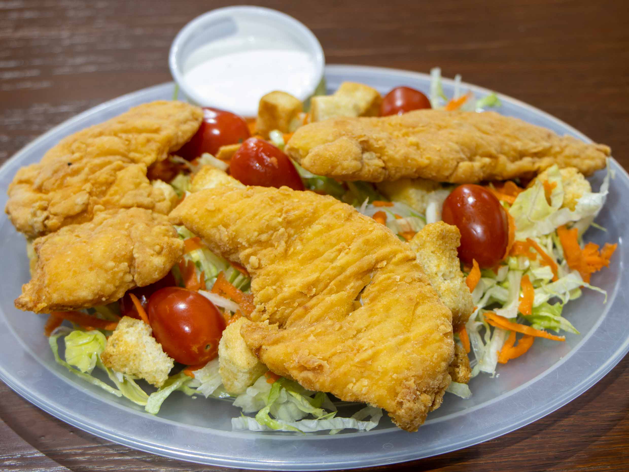 Fajitas de pollo empanizadas acompañadas de lechuga, zanahoria, tomate cherry, crutones y aderezo ranch.