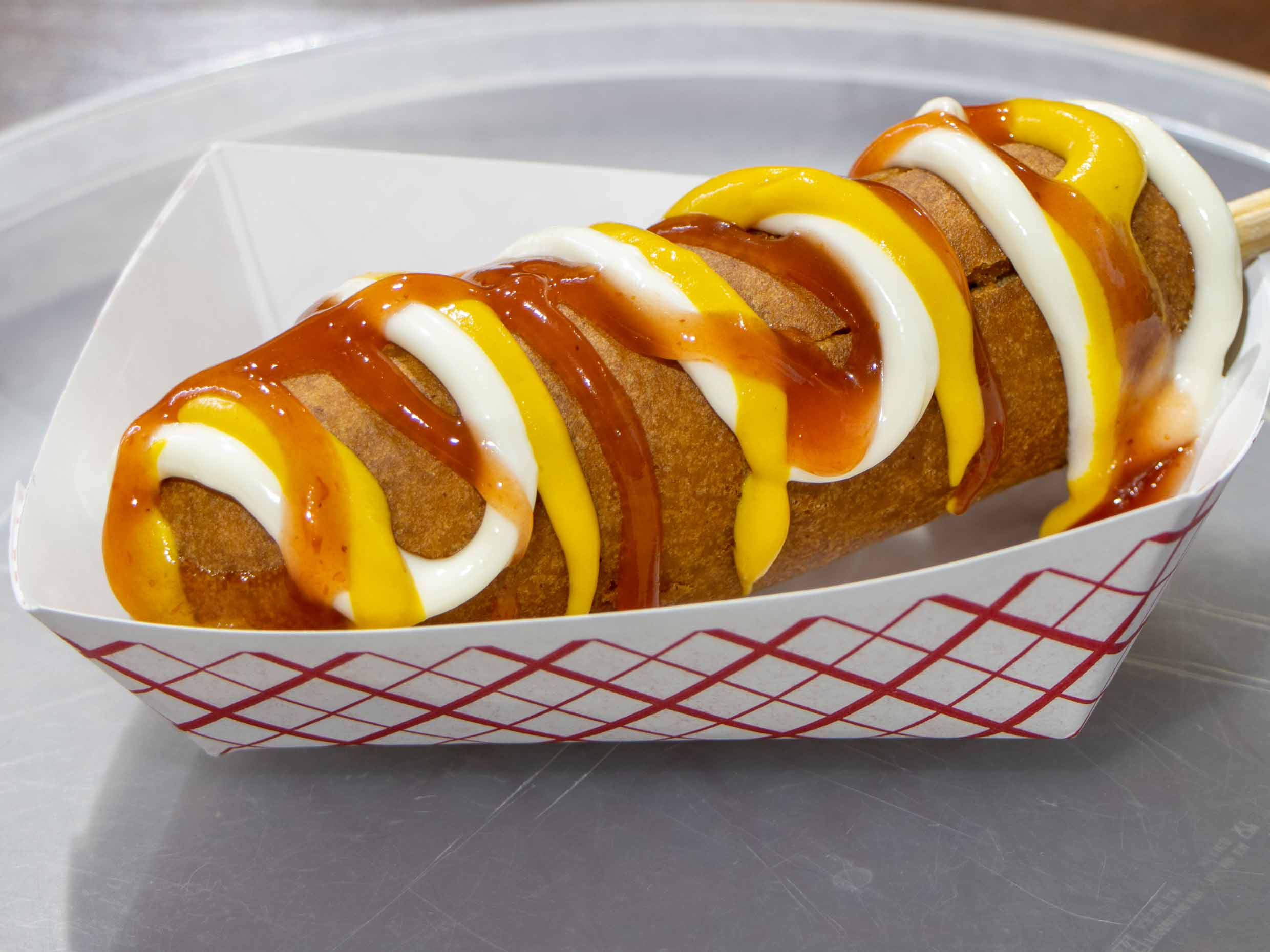 Banderilla de salchicha de pollo acompañada de cátsup, mayonesa y mostaza.