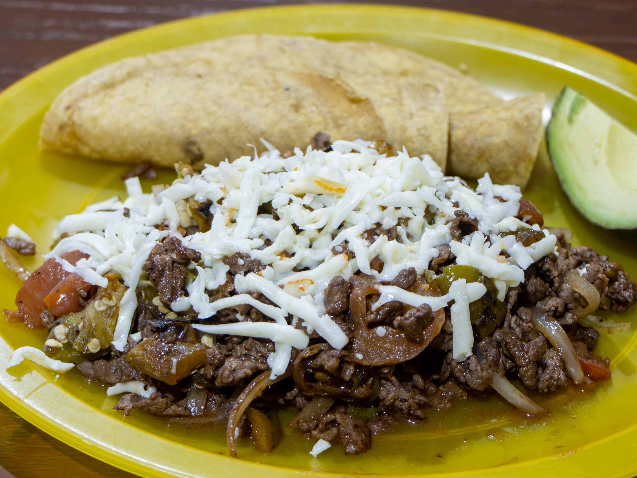 Bistec a la mexicana con queso, lleva 5 tortillas y aguacate.