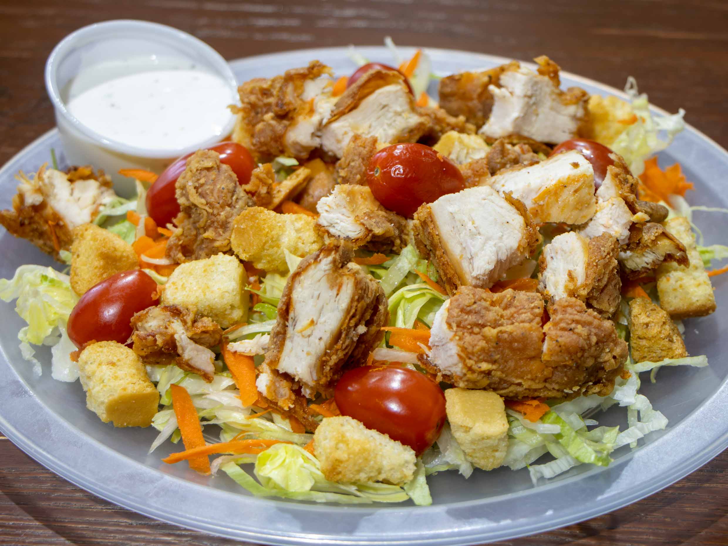 Pechuga de pollo empanizada acompañada de lechuga, zanahoria, tomate cherry, crutones y aderezo ranch.