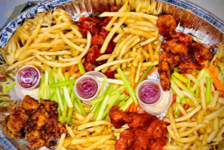 CHAROLA DE BONELESS 35 PZ , VERDURA, PAPAS Y ADEREZOS