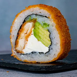 Rollo de Sushi Empanizado, Con Pollo, Aguacate, Queso Philadelphia y Pepino