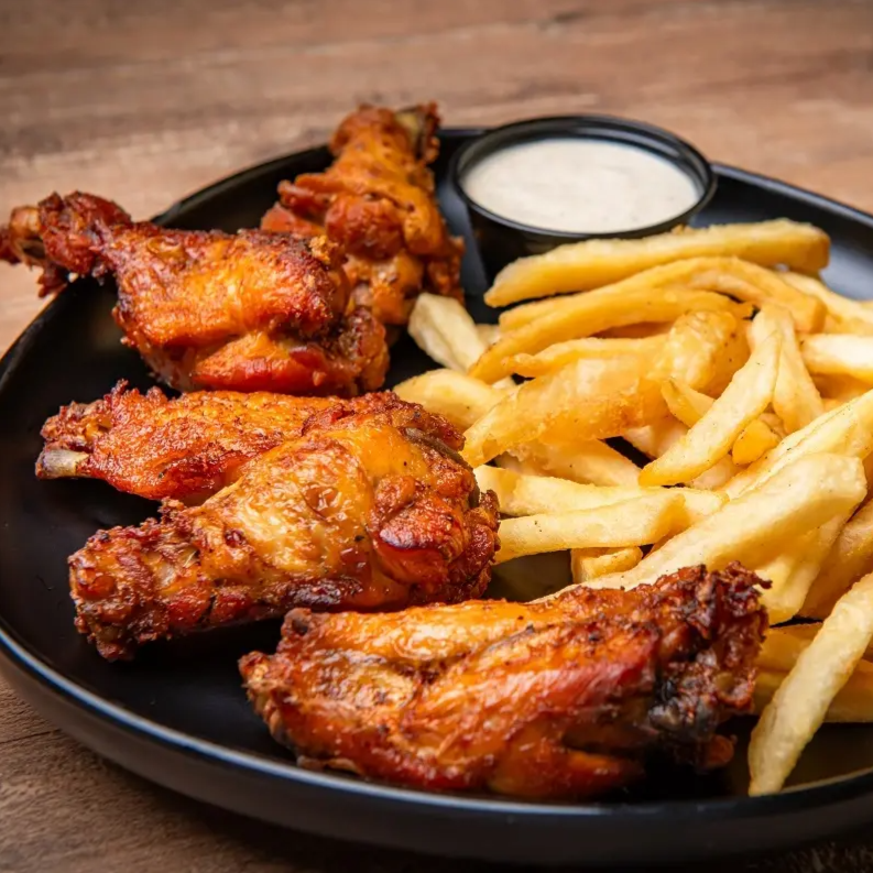 10 Alitas Bañadas en tu Salsa Favorita Acompañadas de Papas fritas y una Porcion de Ranch