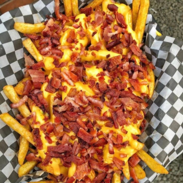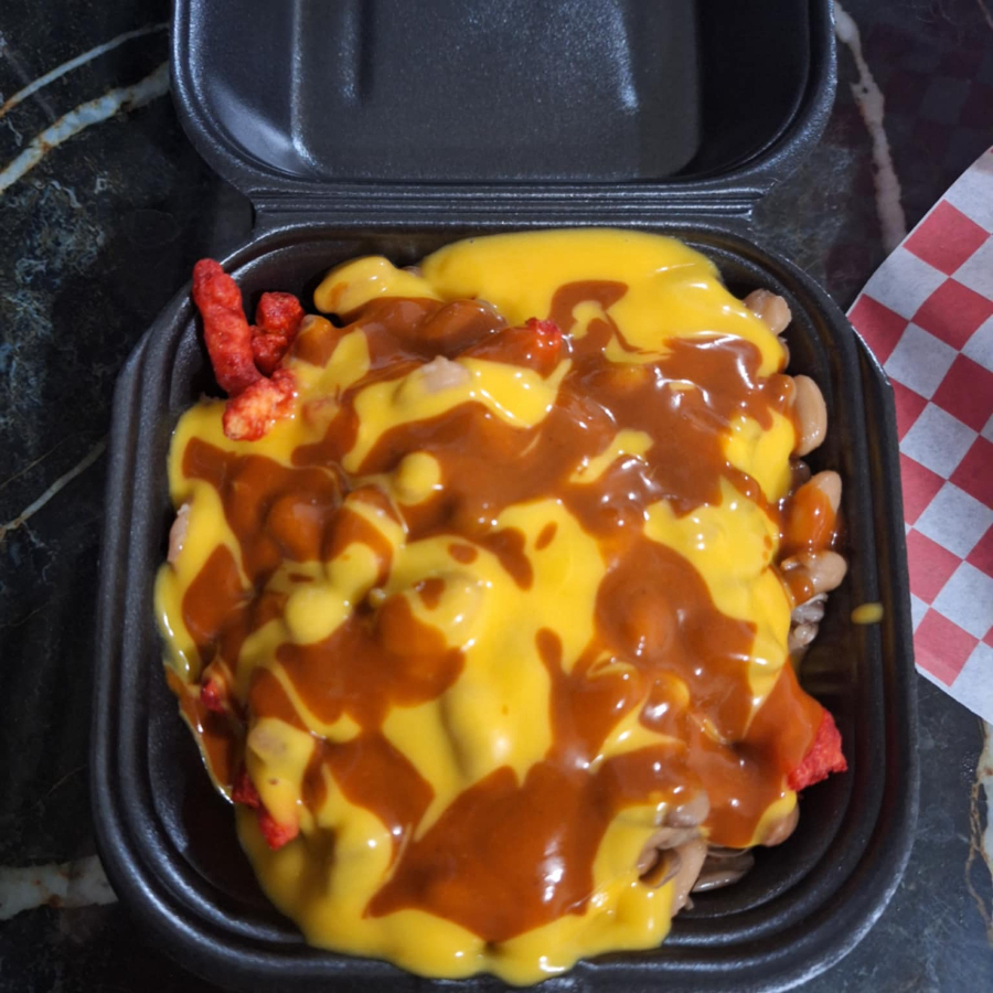 Orden de papas con salchicha, bañadas en queso, mayonesa y ketchup