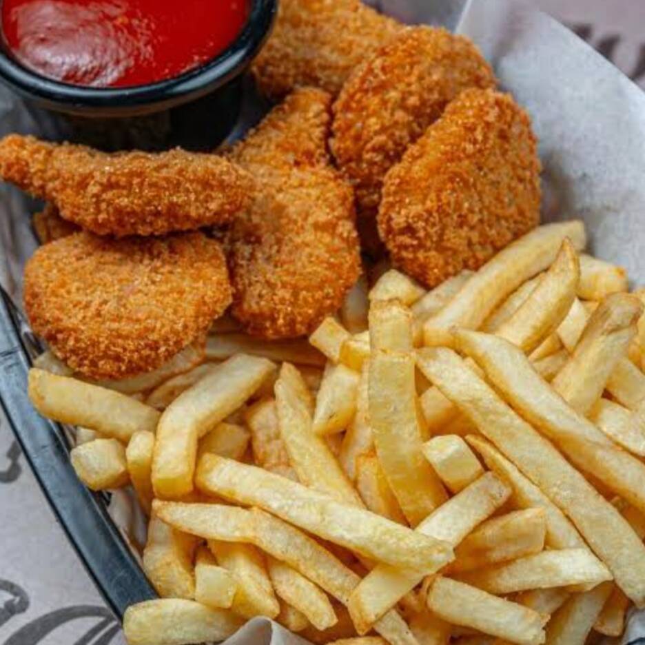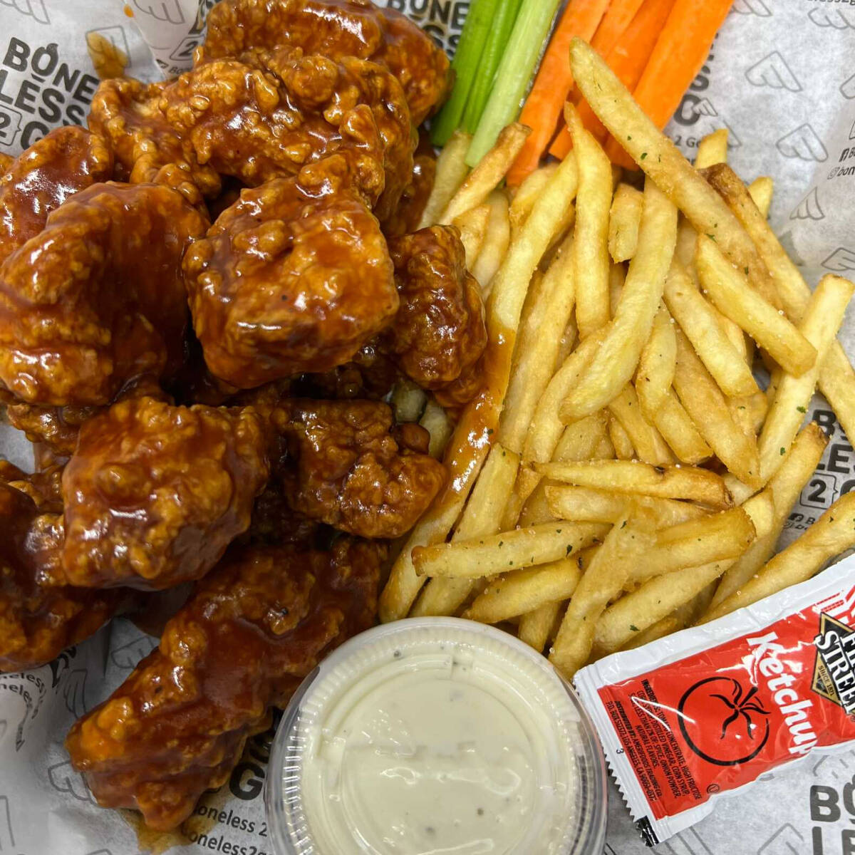 300gr de bonneles acompaño de papas fritas, Ranch, Ketchup y verdura