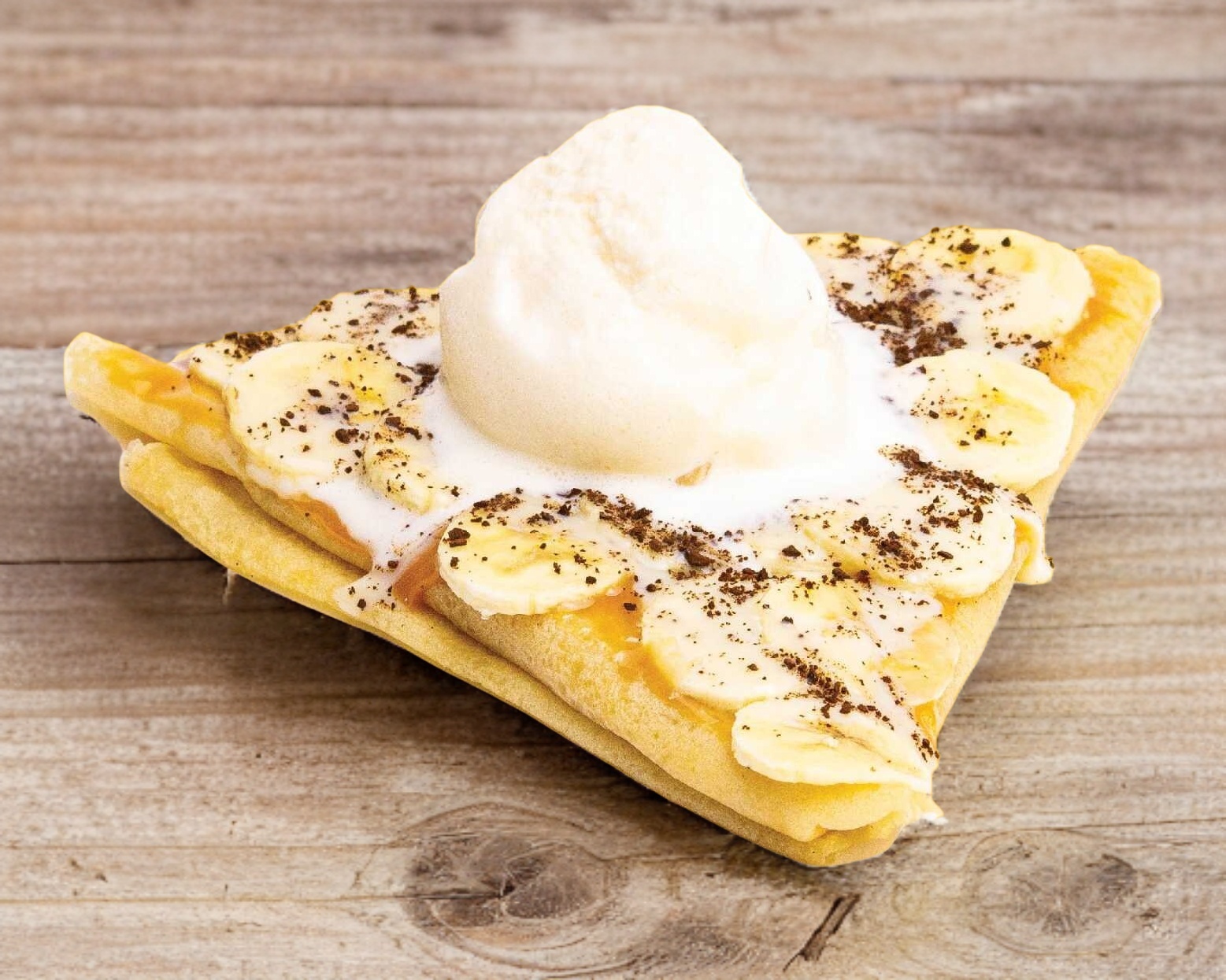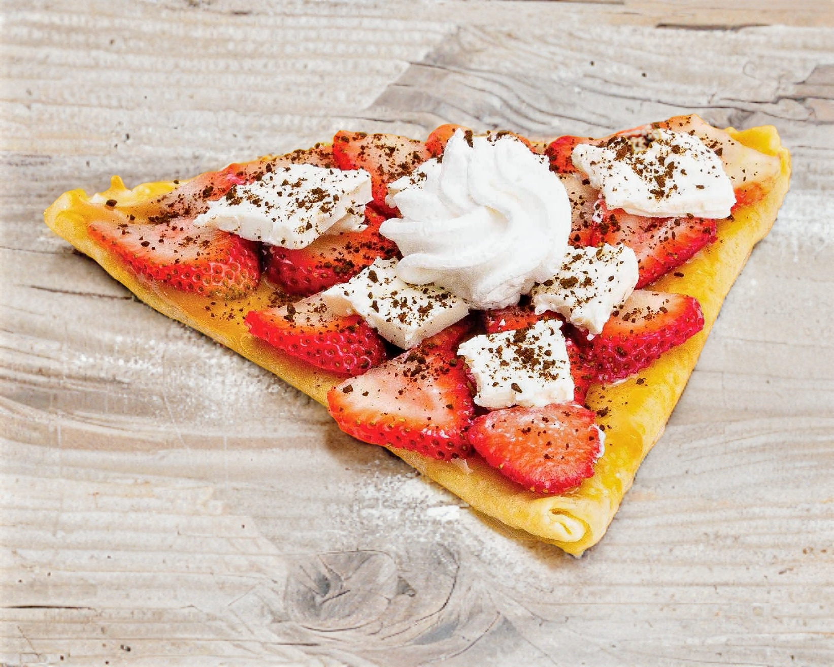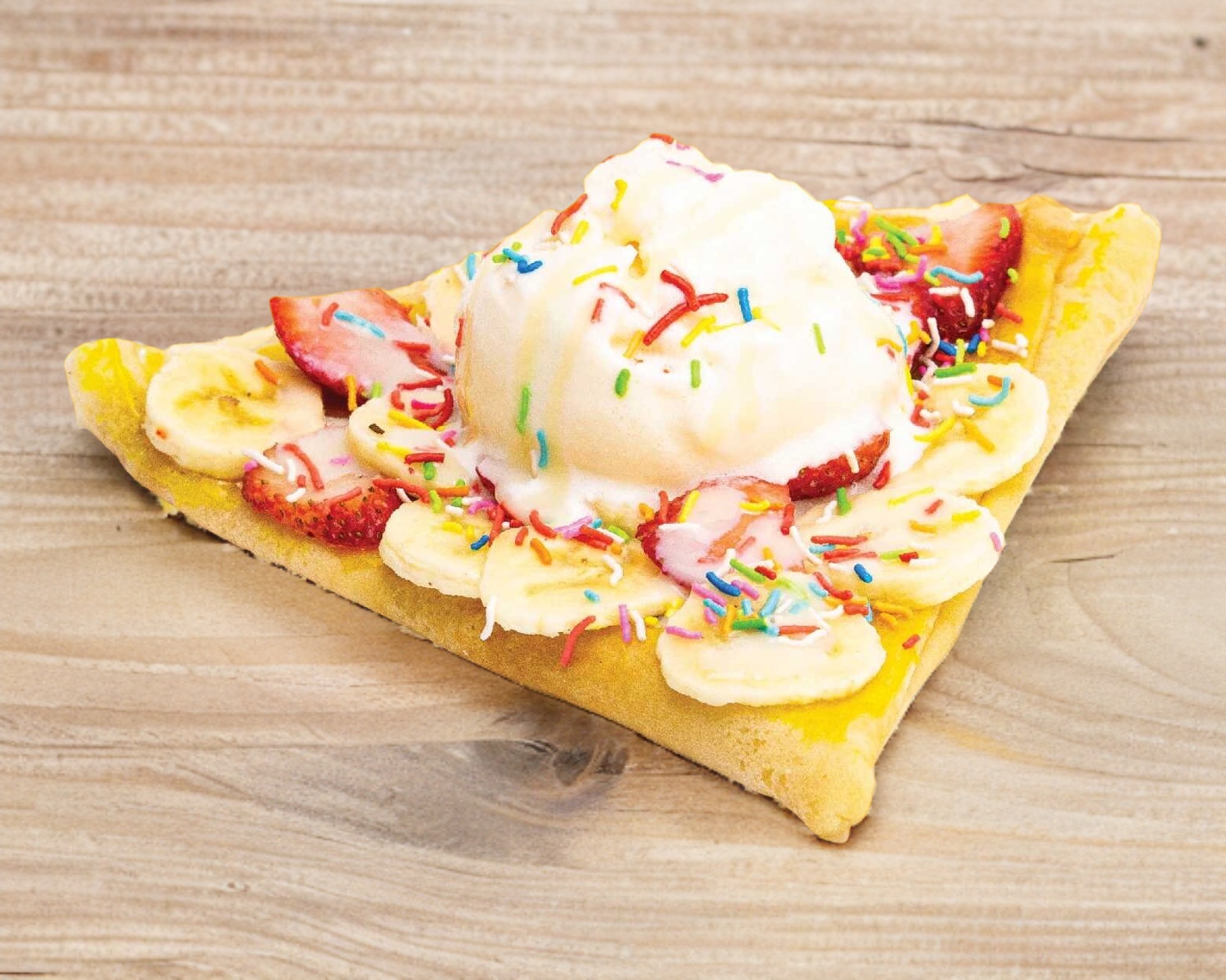 Combinamos la fresa, plátano, mermelada de piña, chispas de colores, La Lechera y helado en esta crepa muy cool.